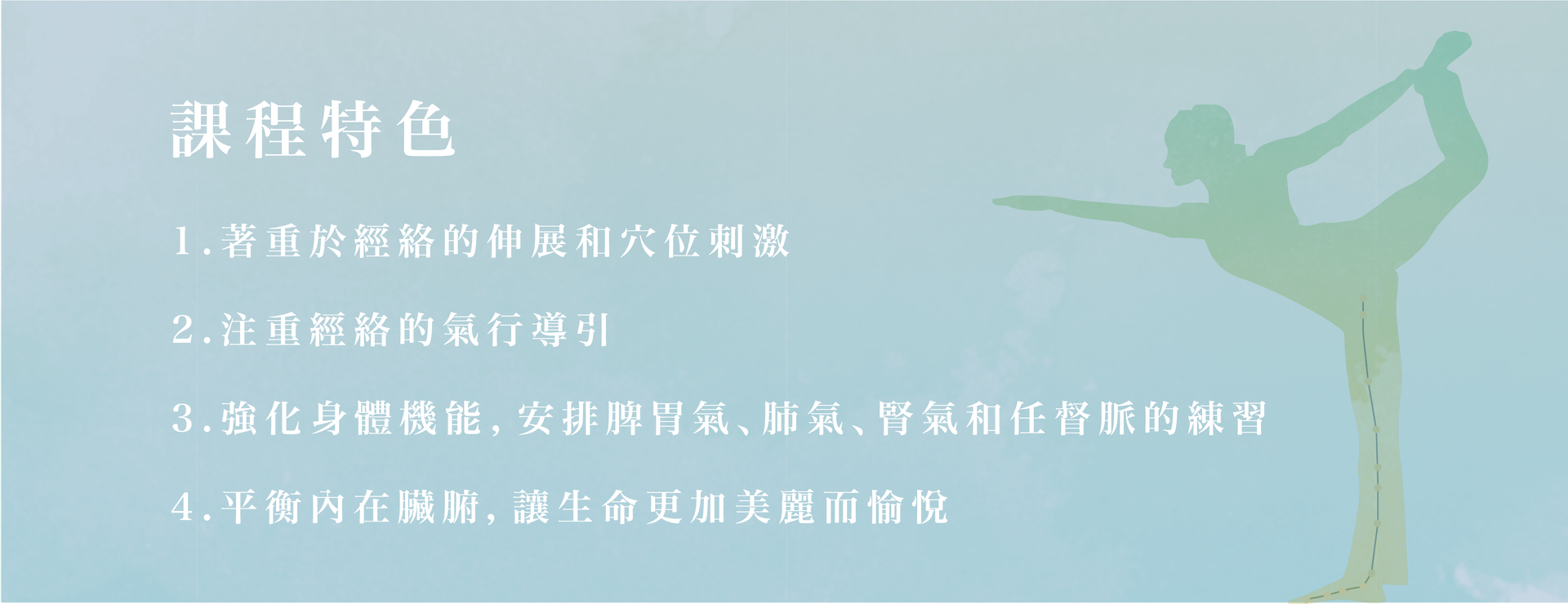 2.經絡瑜伽注重的是經絡的氣行導引,要想融入氣行的狀態,要能將專注放入動作的行進中,更需要放下與全心交付。