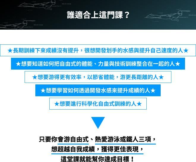 專為已會游泳且熱中訓練,想游得更快更好的泳者及三鐵愛好者所設計,