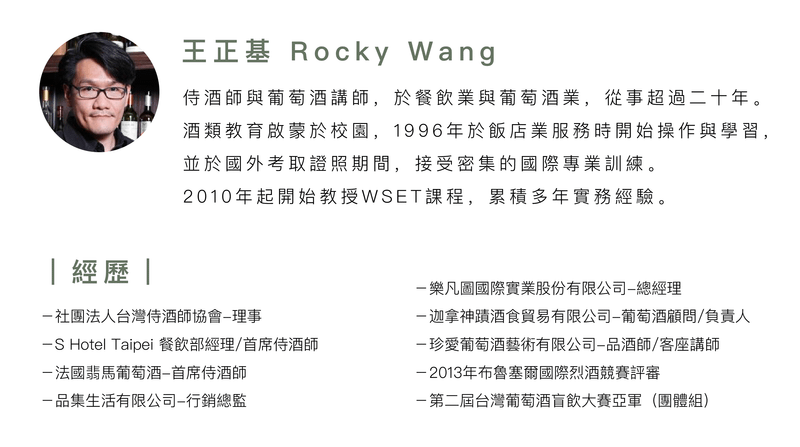 2010 年起開始教授 WSET 課程,累積多年實務經驗。擅長品飲技巧分析,幫助強化學員的品酒技巧,同時也融會多年的餐飲經驗於課程之中。