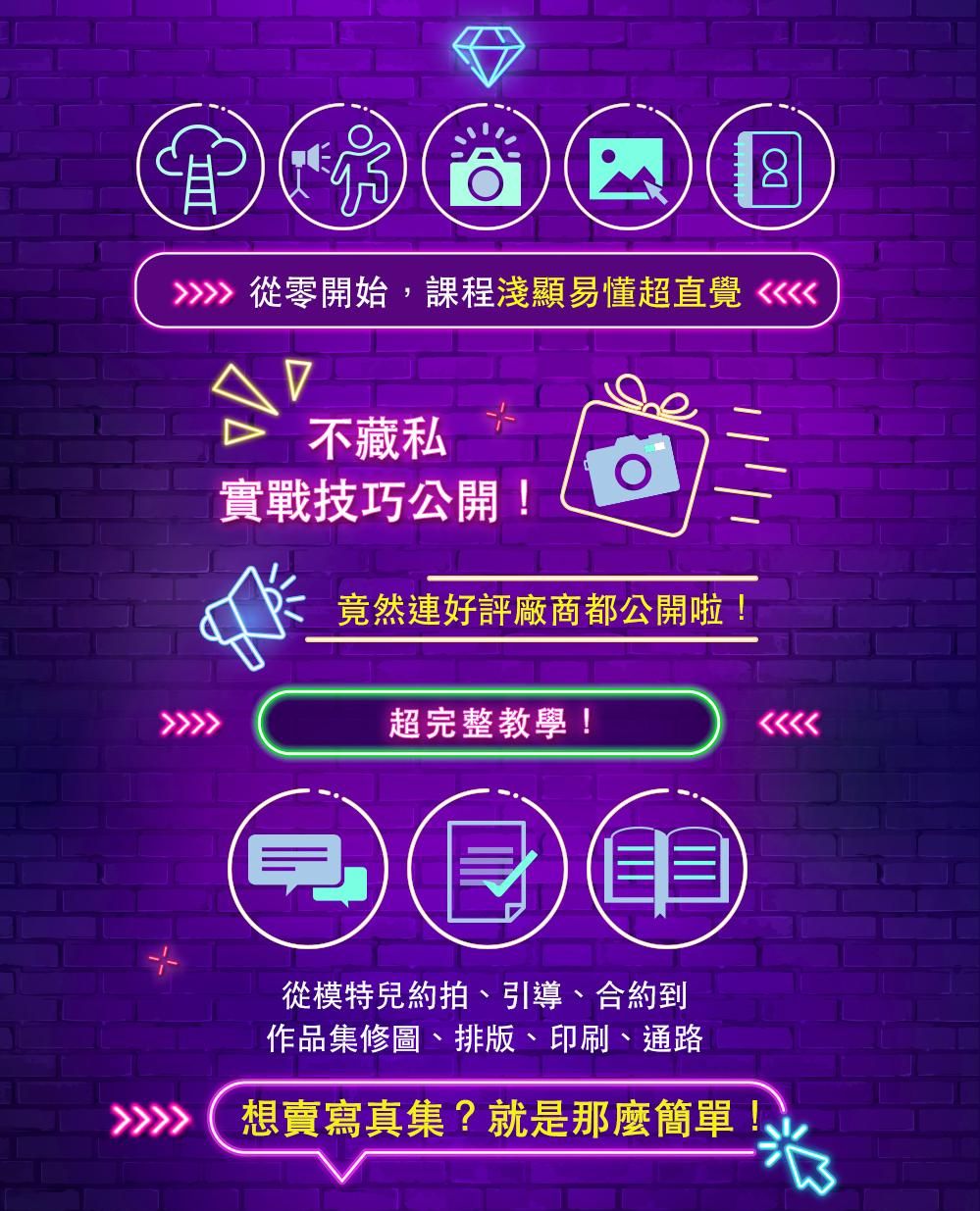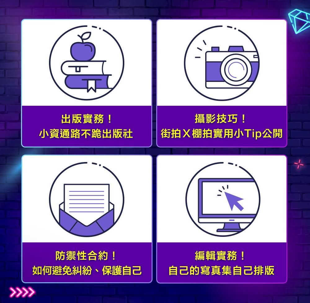 |出版實務:現在你已經有許多美美的作品,該如何自己修圖、排版、印刷、尋找通路⋯⋯?連攝影師最苦惱的「行銷撇步」課程中也一併把秘訣偷偷告訴你。