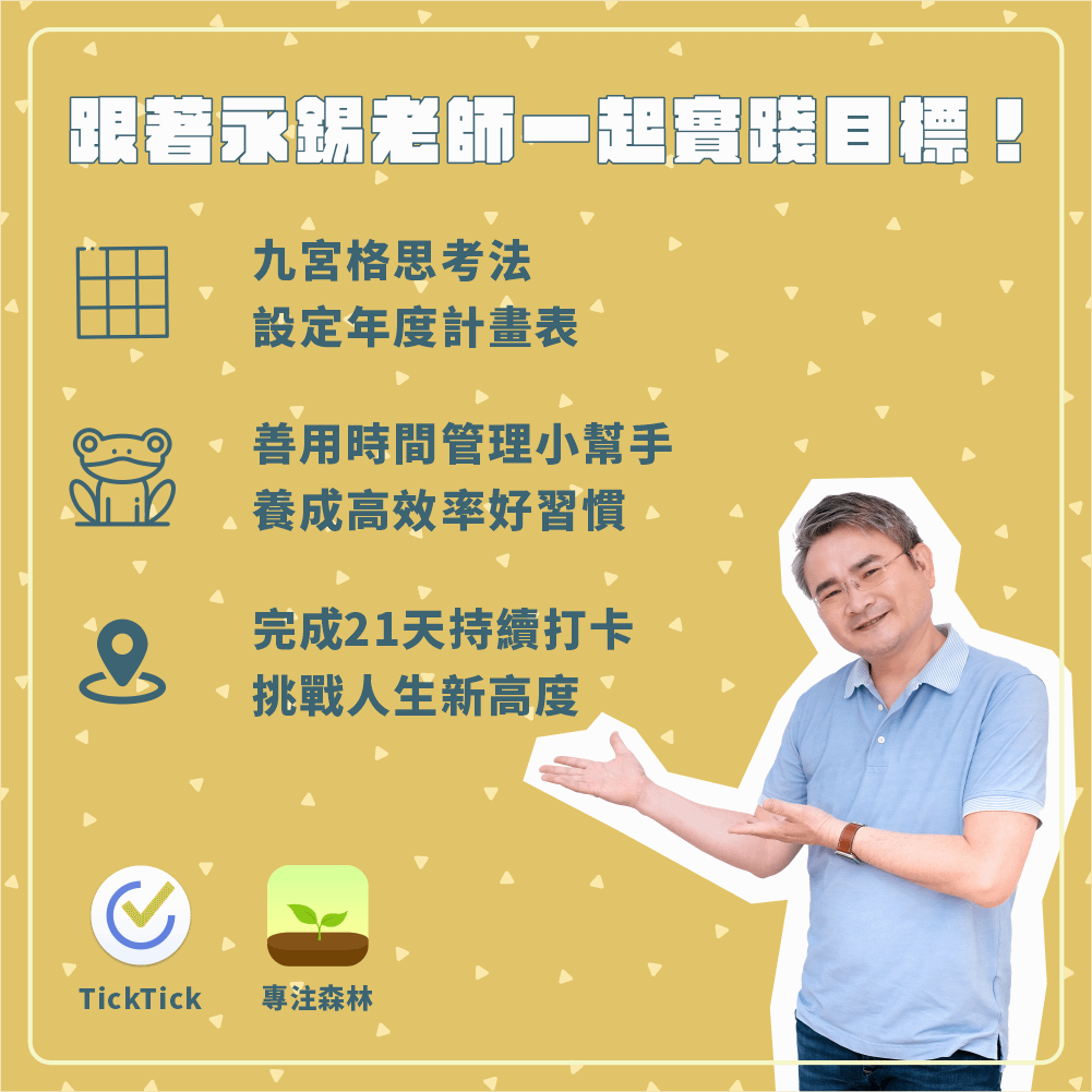 - 未來不再是一場空!跟著永錫老師一起完成九宮格年計畫,透過有效與系統的方式,規劃好自己的時間與人生!