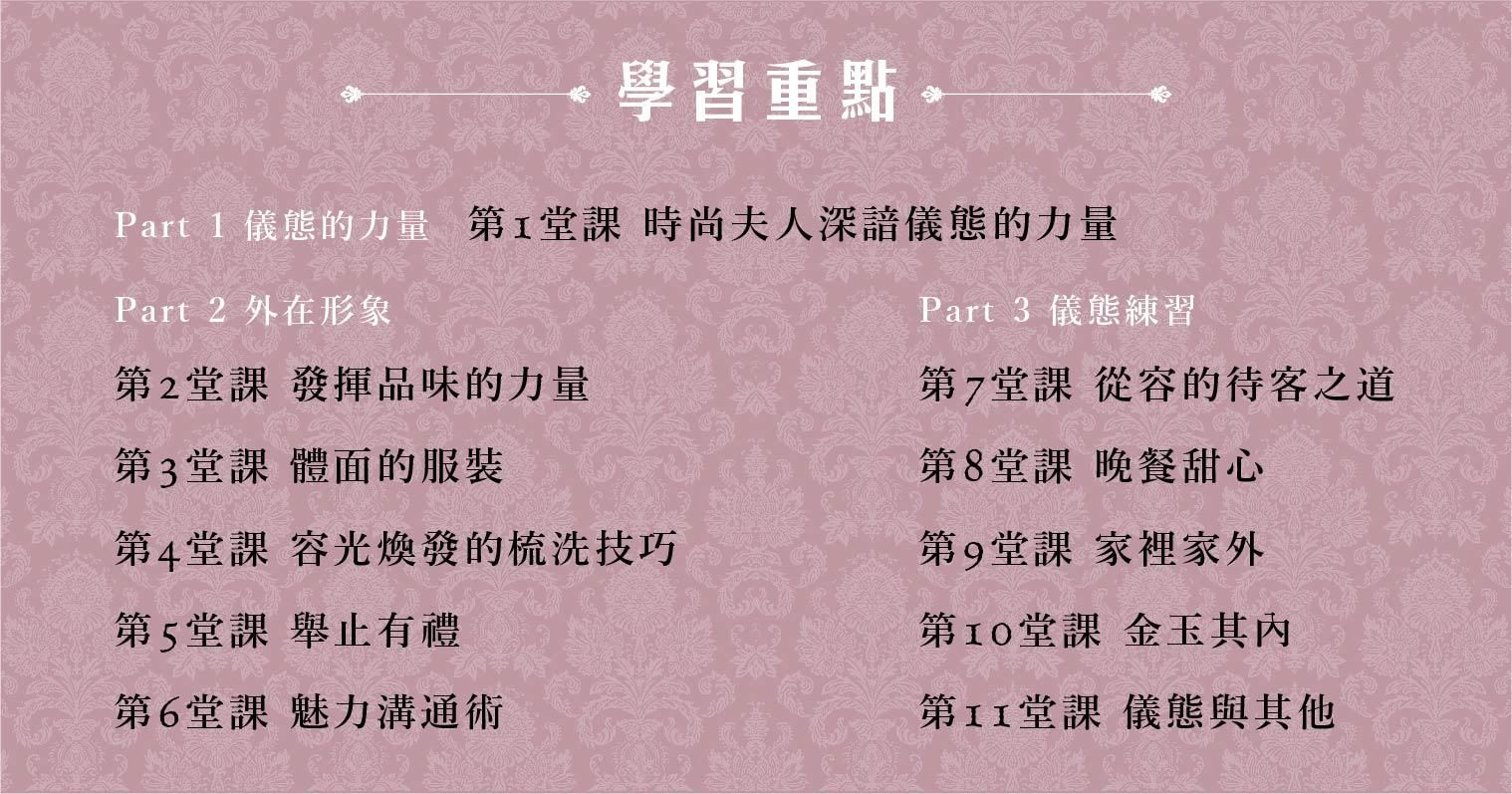 得體的拒絕/當個好客人/接受讚美/ 優雅進食秘訣/打造個人風格/當個好鄰居/ 守時的美德/基本的梳洗打扮/練習螢幕禮節/ 練習良好儀態/合宜的穿著/保持神秘感/公開演講的台風......