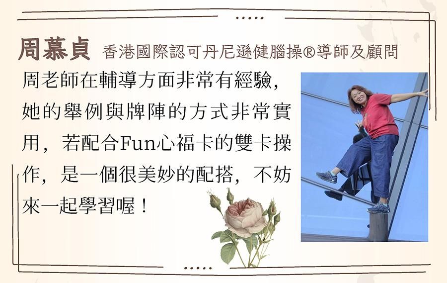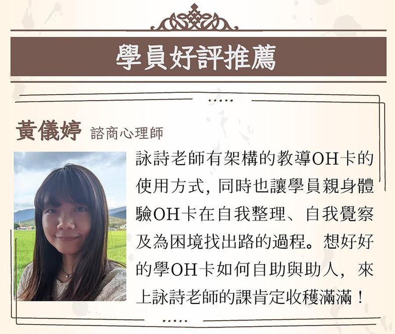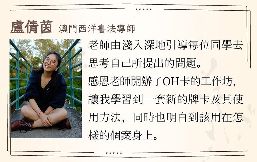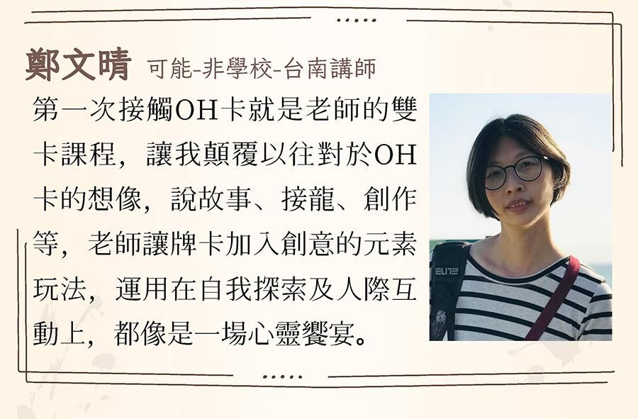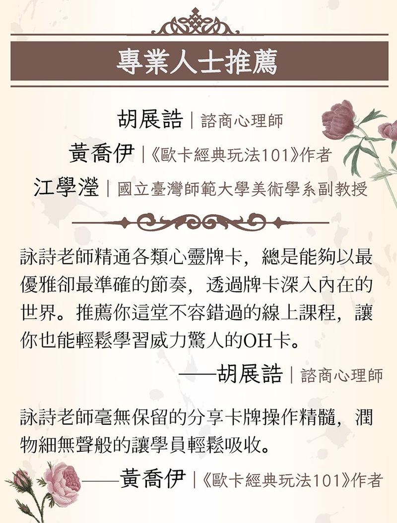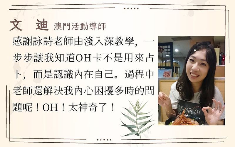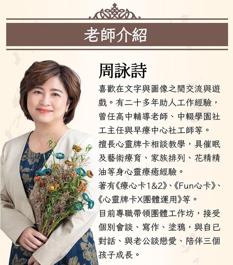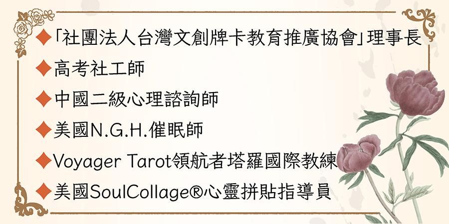 擅長心靈牌卡相談教學,具催眠、藝術療育、家族排列、花精精油等身 心靈療癒經驗。