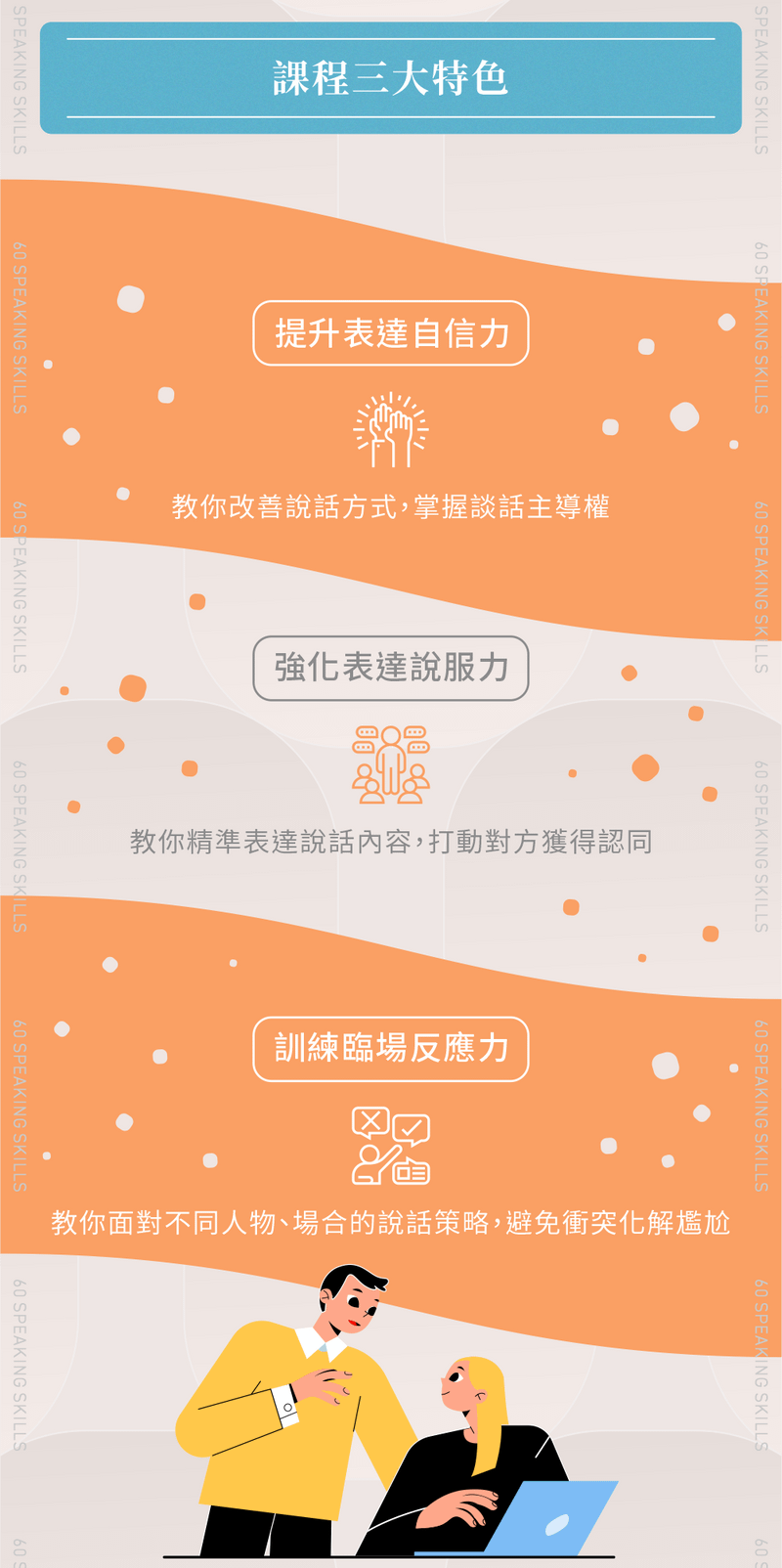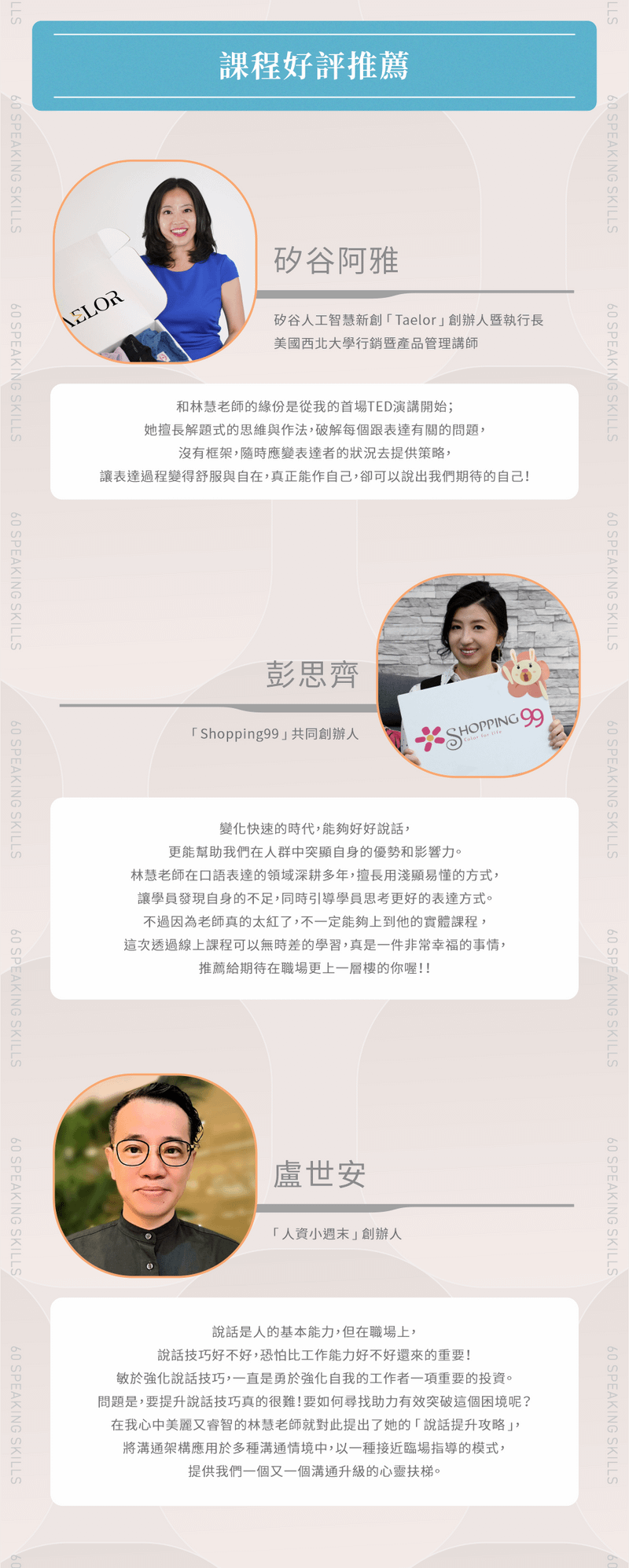 • 400位以上一對一客製化表達訓練師,年齡層由六歲到八十歲皆有
