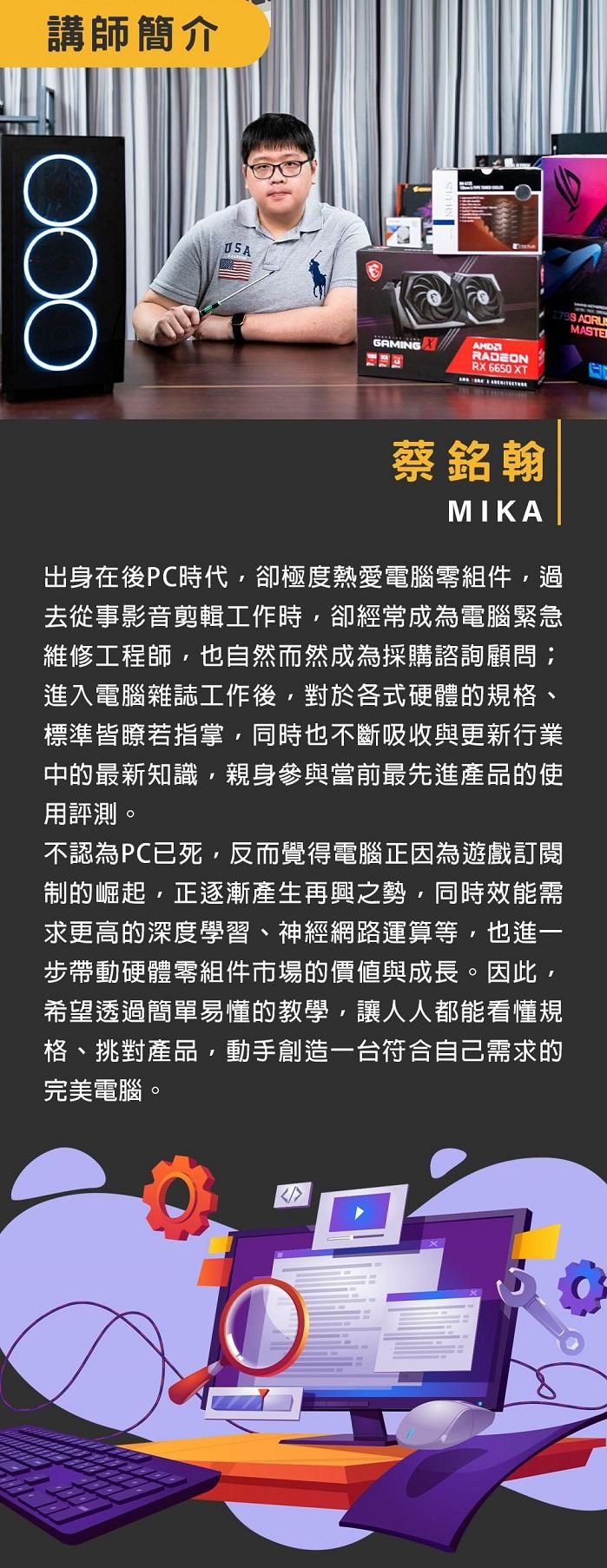 無論你是一般消費者、創作者或遊戲玩家,也不論你對於電腦硬體是否具備任何相關知識,或者已遠離電腦DIY領域一段時間,只要你想要自己動手,拿起工具打造出一台專屬於自己的電腦,本課程的各項內容都將可以滿足你的需求!