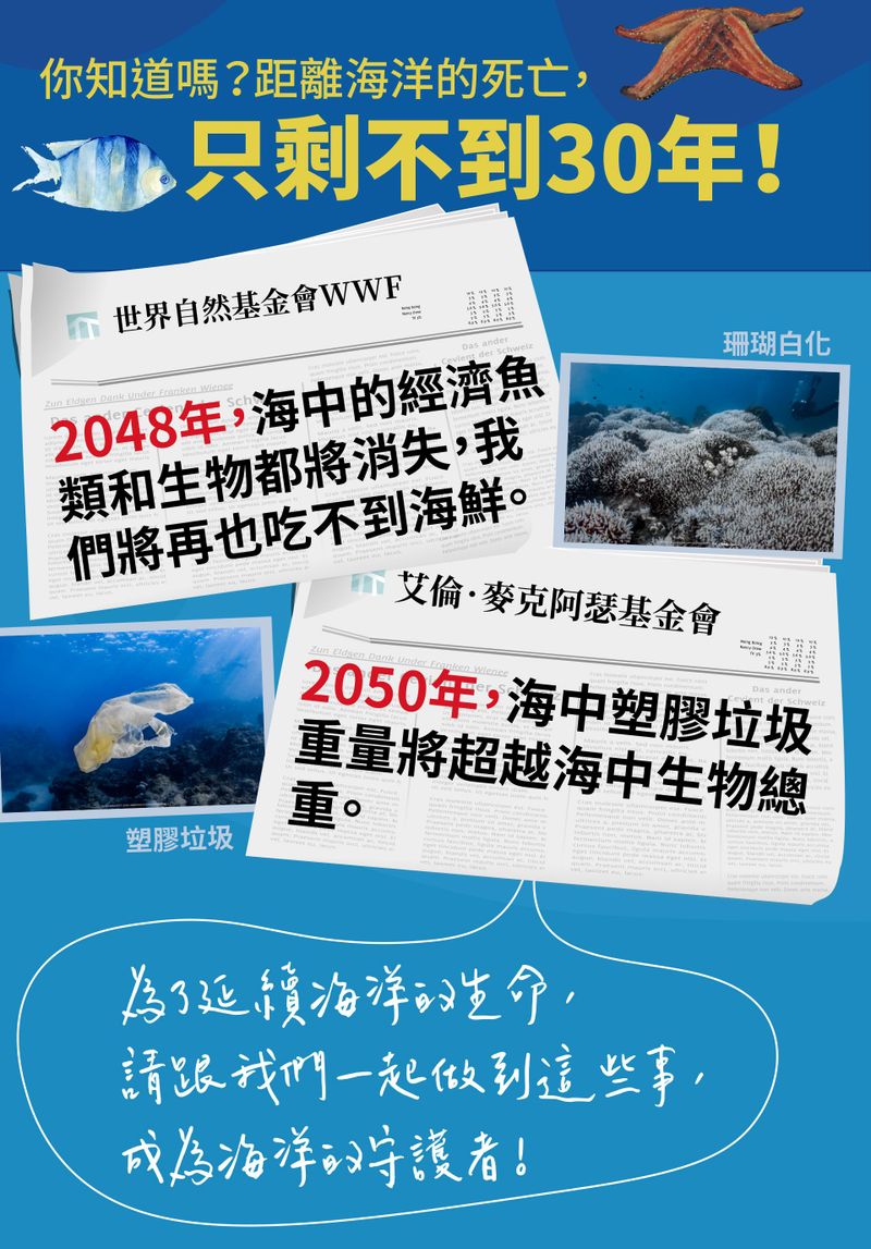 - 氣候危機:海洋吸收超過 90% 人類活動排放的溫室氣體熱能,失去海洋,地球暖化問題將急速惡化。