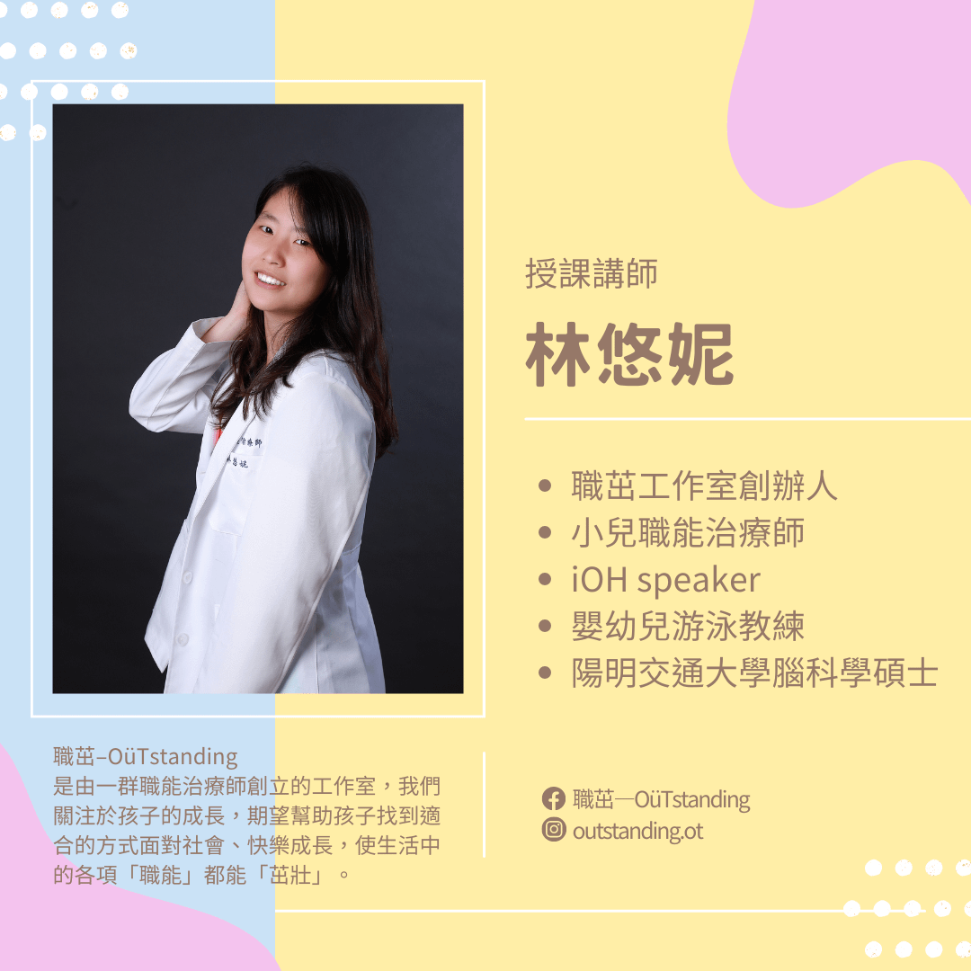 本課程由小兒職能治療師林悠妮授課,教你如何幫助孩子成功銜接家中及學校生活,讓寶貝可以順利度過學校這個小型社會的考驗,享受精彩的校園生活!
