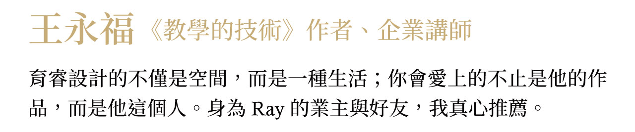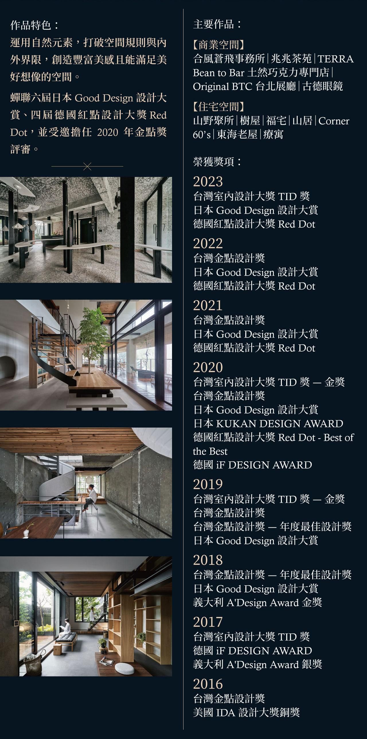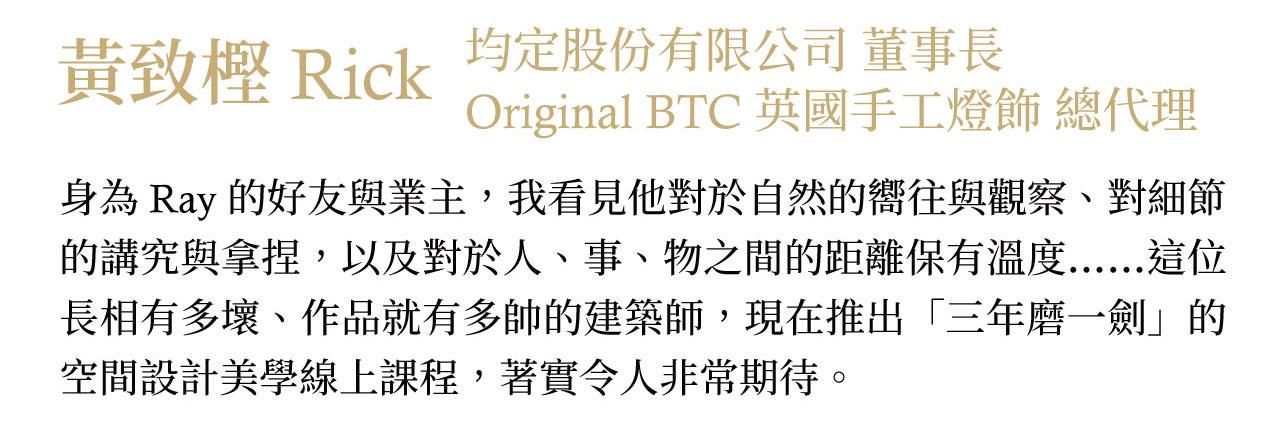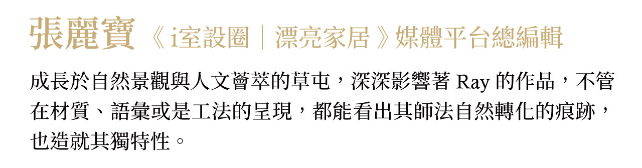 從《漂亮家居》到《 i室設圈│漂亮家居 》媒體平台總編輯,身為台灣室內設計圈資深媒體人,持續挖掘新世代設計新銳日是一直以來的始命,第一次認識Ray是通過其「東海佗寂之境」老屋整建的作品,爾後在TID台灣室內設計大獎的頒獎典禮上,見到本尊更感受他人與作品所表現的真摯與自然,成長於自然景觀與人文薈萃的草屯,深深影響著Ray的作品,不管在材質、語彙或是工法的呈現,都可以看出其師法自然轉化的痕跡,也造就其獨特性。相信學員在上了這堂課,必然能有所獲,對自然在空間美學有更深層的體悟及轉化。