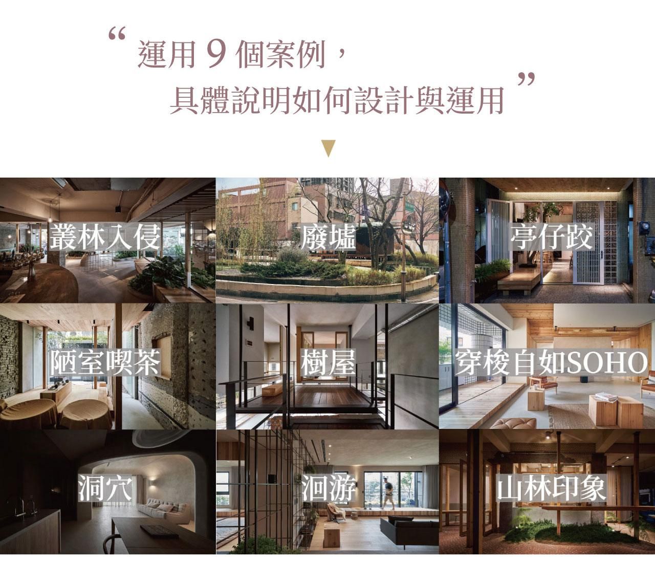 作品特色在於運用自然元素,打破空間規則與內外界限,創造豐富美感且能滿足美好想像的空間。