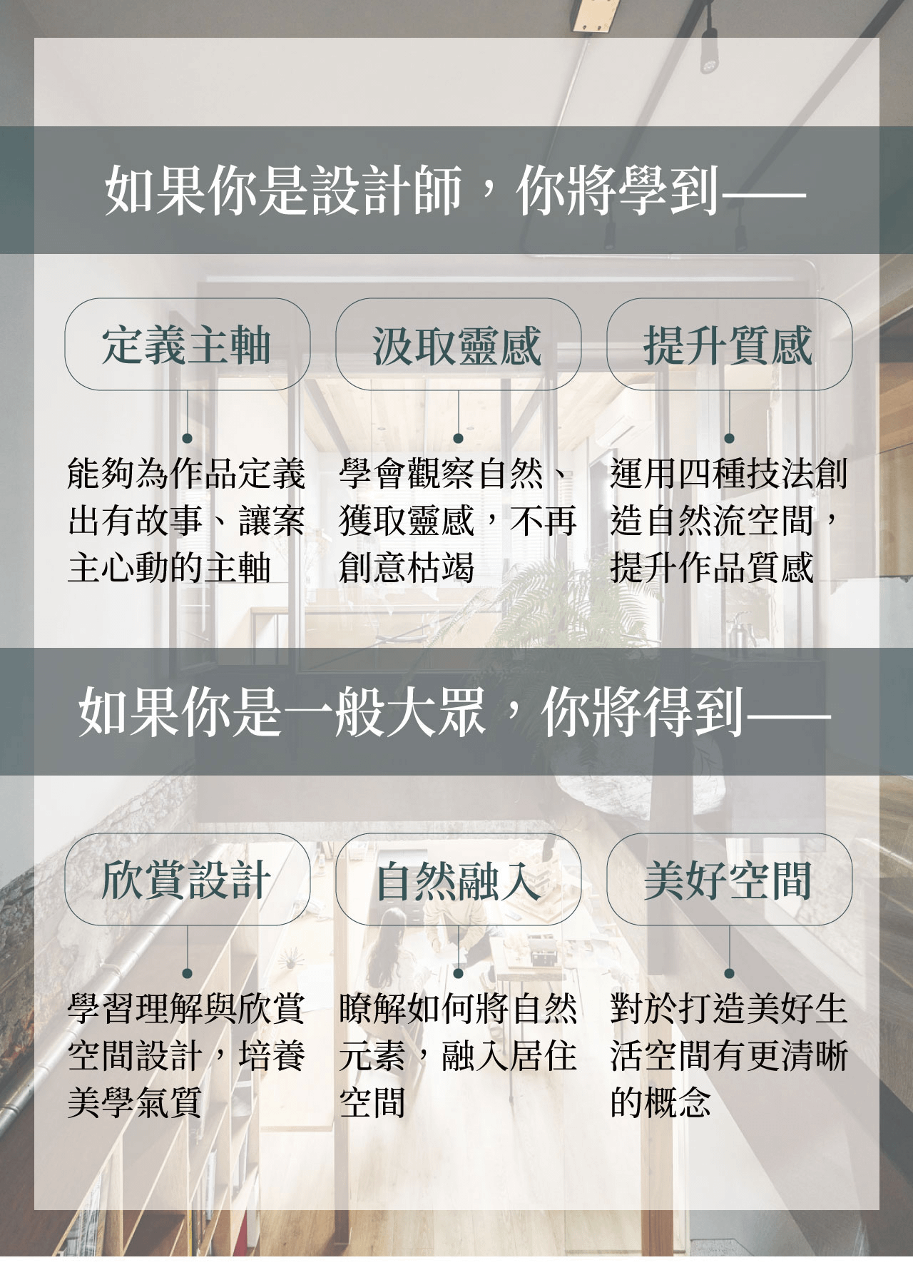 國際大獎的空間設計,不只用天才二字解釋。張育睿建築師將自己打破空間限制 ,讓光及空氣在空間中有機流動的設計祕訣,在這堂課程中完整無私分享。不管是設計學習者,或者是對空間美學有興趣的大眾,都不應錯過這一堂課!