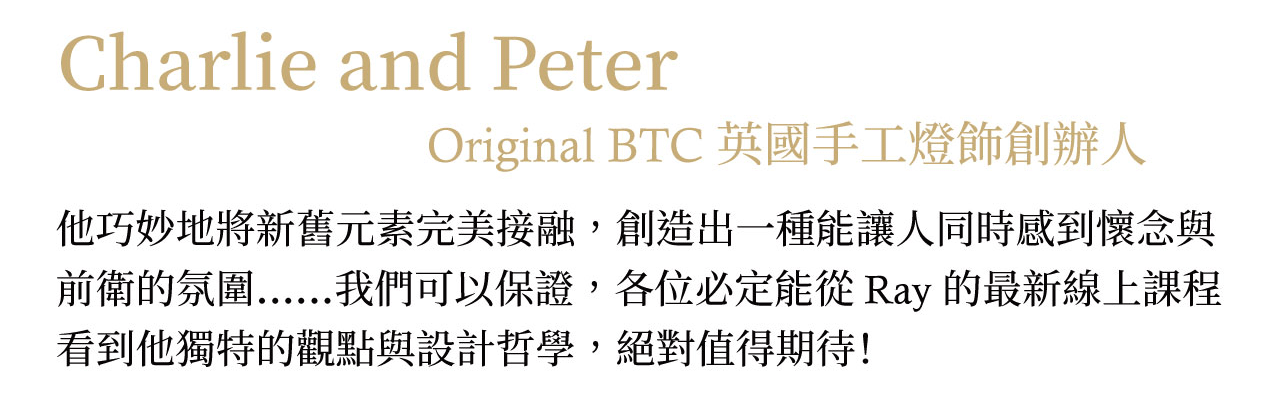 我深信設計的內涵取決於設計者本身的生命厚度。身為Ray的好友與業主,我看見他對於自然的嚮往與觀察、對細節的講究與拿捏,以及對於人、事、物之間的距離保有溫度。所以當我把Original BTC英國手工燈飾/台北展廳交由他規劃時,唯一需要提出的只有品牌的核心目標與百分之百的信任,這樣的成果顯然也讓Charlie和Peter(Owners, Original BTC)大為驚艷,更拿下2023年RedDot Award。