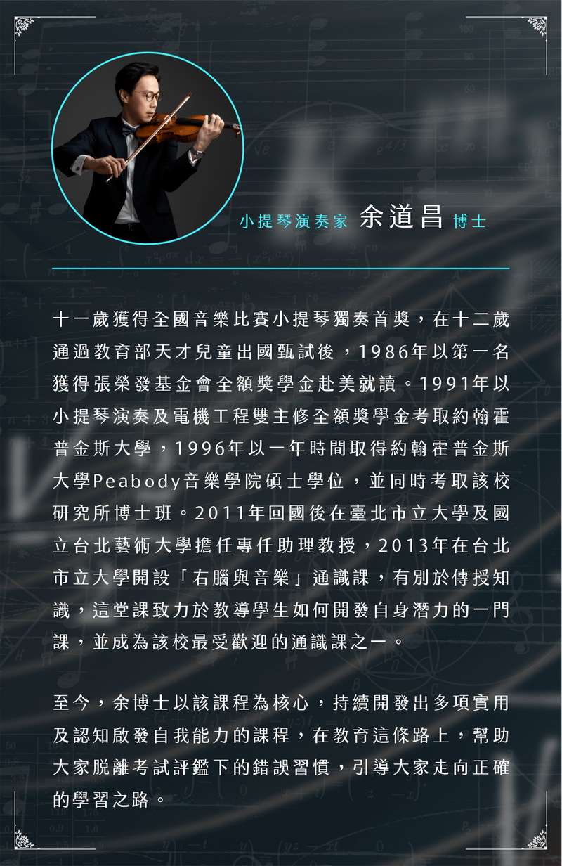 余博士將運用其豐富的演奏與教育經驗,將理論與實踐相結合,帶領你從音樂出發,了解成功心態、智力發展與大腦學習的重要關聯