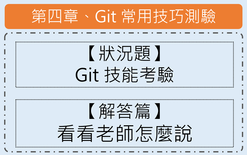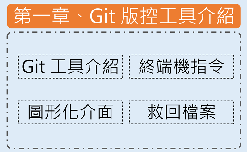 第一章會介紹業界最常用的版控工具 Git 具備哪些特色與優勢,接著讓你在本機建置好作業環境,介紹終端機常用的 Git 指令與運作模式,並利用圖形化介面(SoureTree)輔助說明,讓你更清楚瞭解終端機做了什麼事情,藉此孰悉操作環境與 Git 基本工作流程。