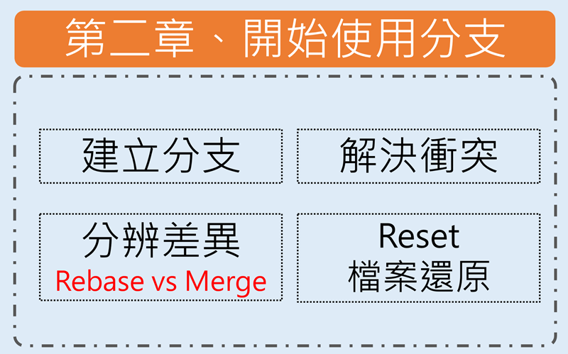 「分支」是 Git 很大的賣點之一。這個章節將會帶你實際操作分支的各種用法,例如新增分支、合併分支、刪除分支以及解決合併遇到的衝突狀況,以及Reset的正確觀念與用法。