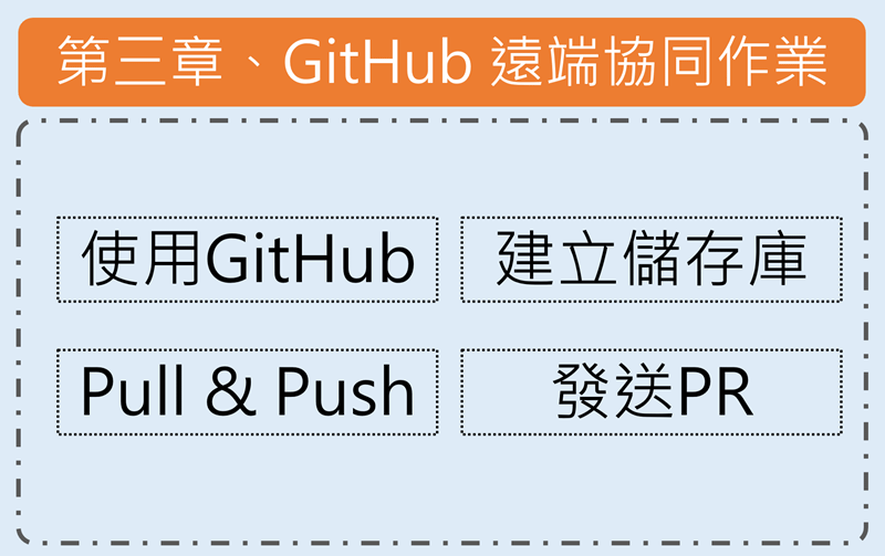 本地端的 Git 操作熟練之後,是時候該到將檔案上傳到 GitHub 見見世面了。這章節會帶你從頭開始使用 GitHub,透過 Push & Pull 同步遠端與本地端資料,實際帶你練習協同作業最重要的步驟-「發 Pull Request(PR)」,熟悉這個步驟與流程之後,就可以在 GitHub 世界與各地的高手交流,藉此增進自己的技術力。