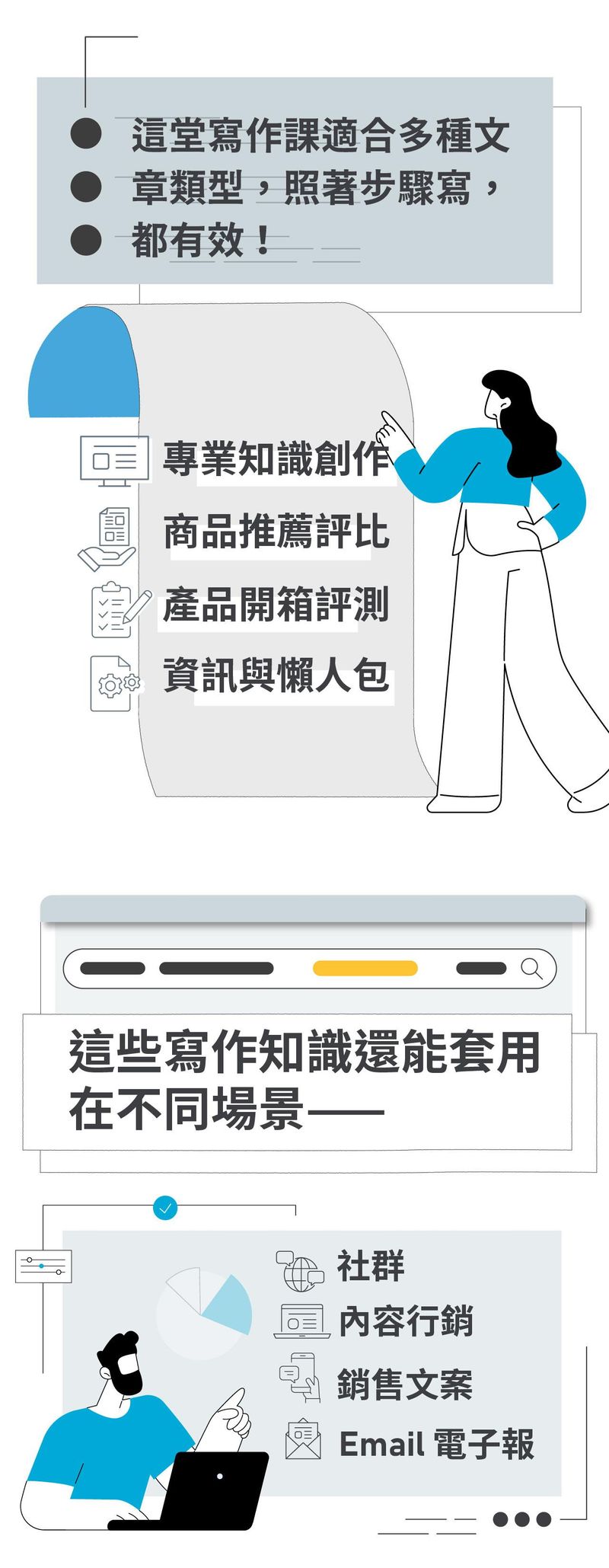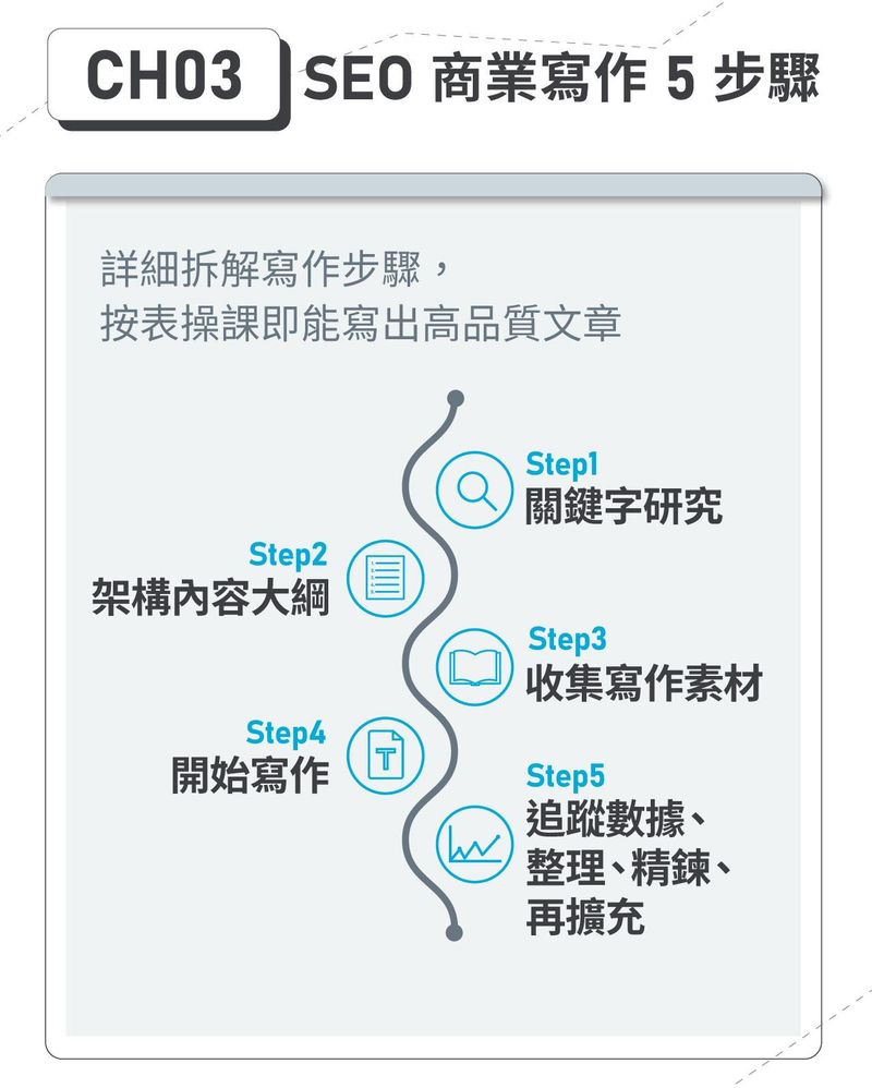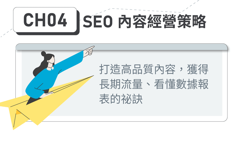 - 「SEO 寫作課 」:步驟化拆解 SEO 文章寫作技巧,以「小白也能學會 SEO 寫作」為主要課程目標,輕鬆好上手。