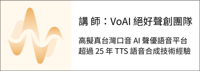 課程講師「VoAI 絕好聲創」團隊,為臺灣在地企業「網際智慧」創立,憑藉超過 25 年的 TTS 語音合成技術經驗,精準捕捉並模擬台灣口音的說話方式,提供超過 50 位的 AI 聲優,讓生成的語音自然且充滿情感、與真人說話的相似度更高。讓高擬真台灣口音 AI 聲音更廣泛應用在各行各業。