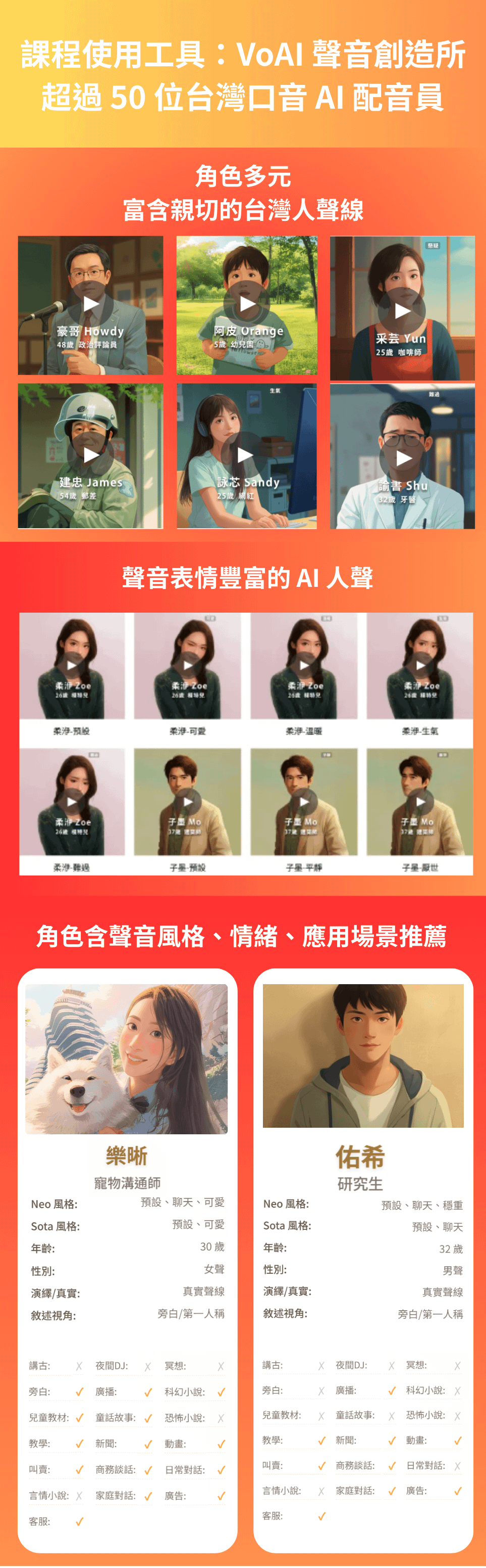 - 作家 & 文字工作者:希望自己的心血結晶能被製作成有聲書?你將學會如何運用 AI 聲優的情感演繹,讓文字中的角色與場景,在聽眾的耳中立體起來。