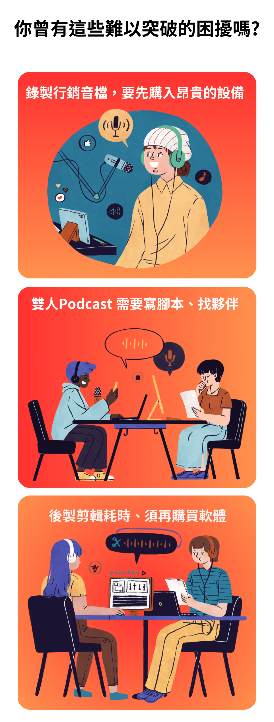 - 預算門檻高:一支好的麥克風、錄音設備、隔音裝潢⋯硬體投資就讓人卻步。