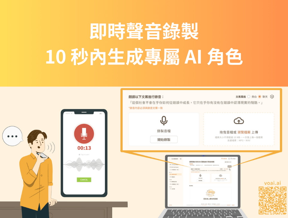 - AI 音色複製:線上快速打造專屬代言人