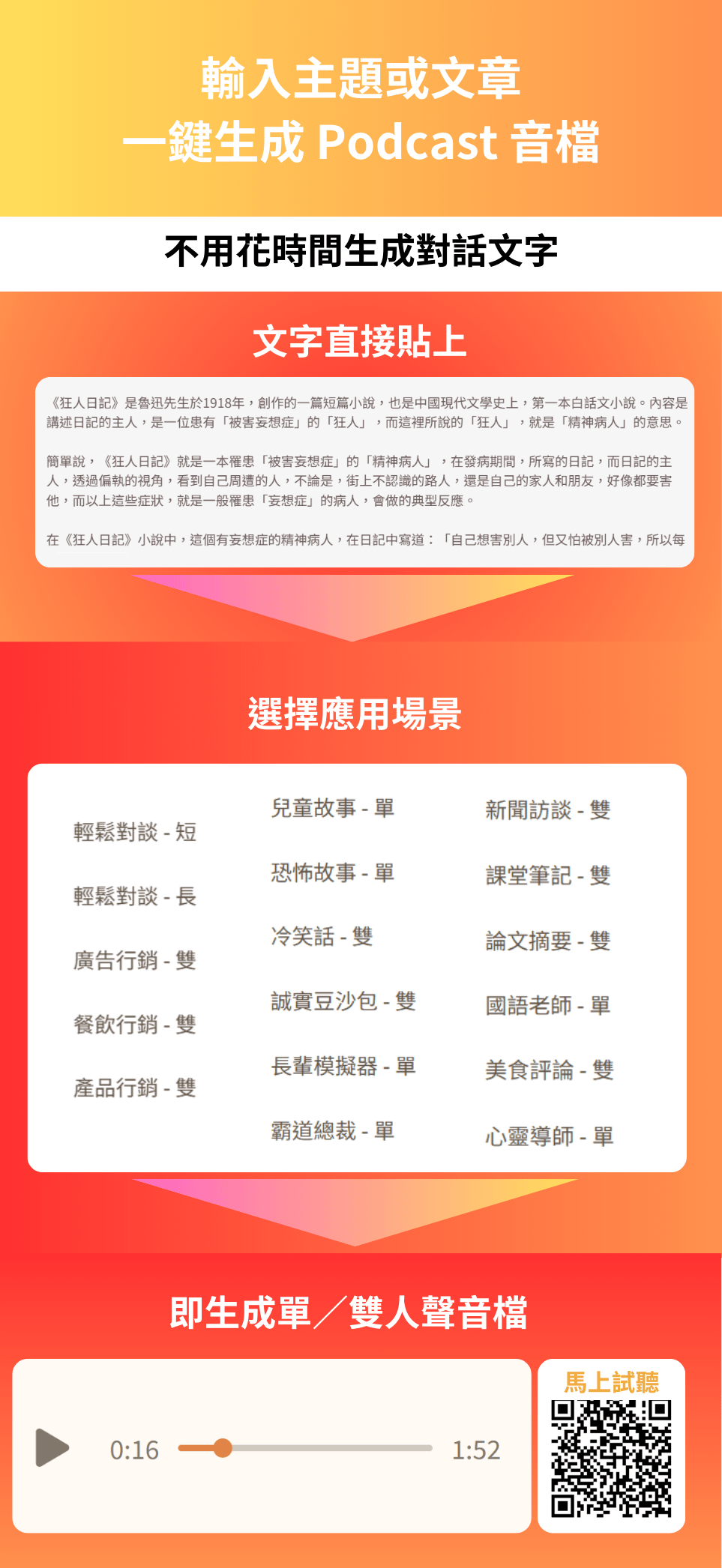 - 實現內容形式升級: 把部落格文章、社群貼文、甚至一張產品圖片,快速生成為有聲書章節、Podcast 單集與聲音廣告,極大化內容的價值與觸及。