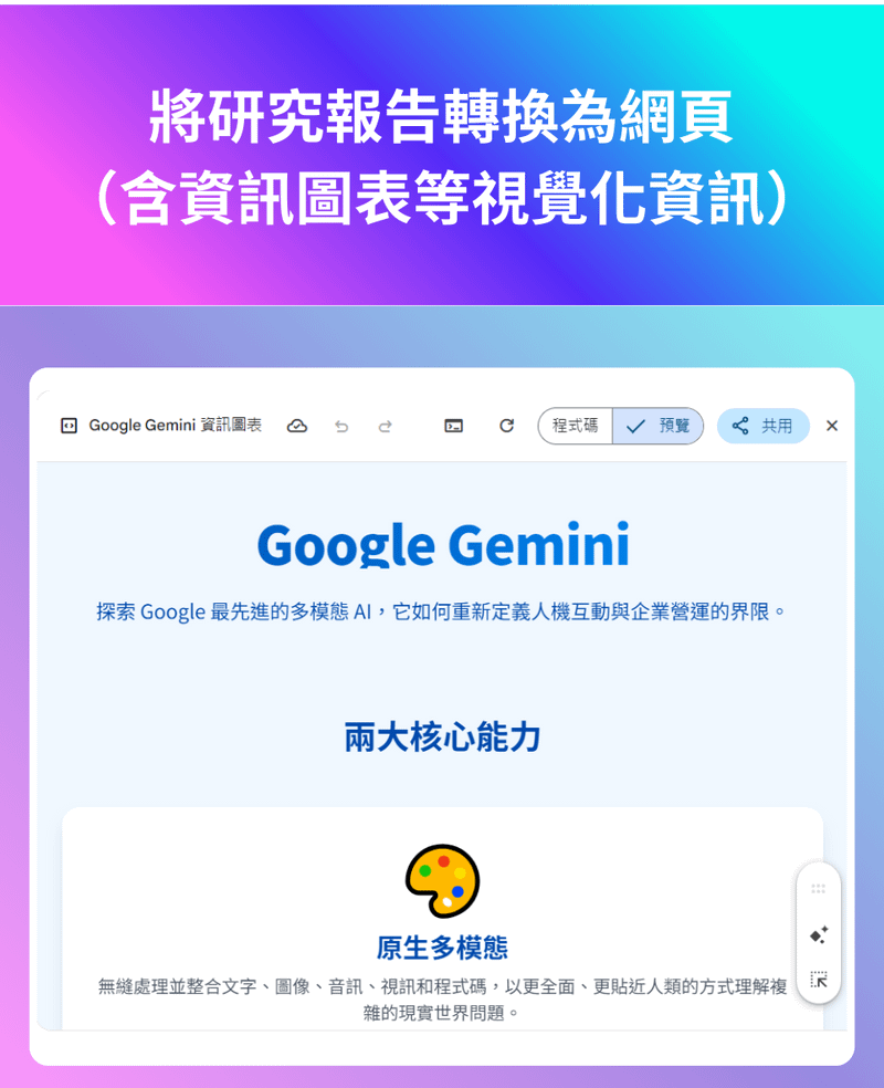 - 將研究報告轉換為網頁、資訊圖表等視覺化資訊