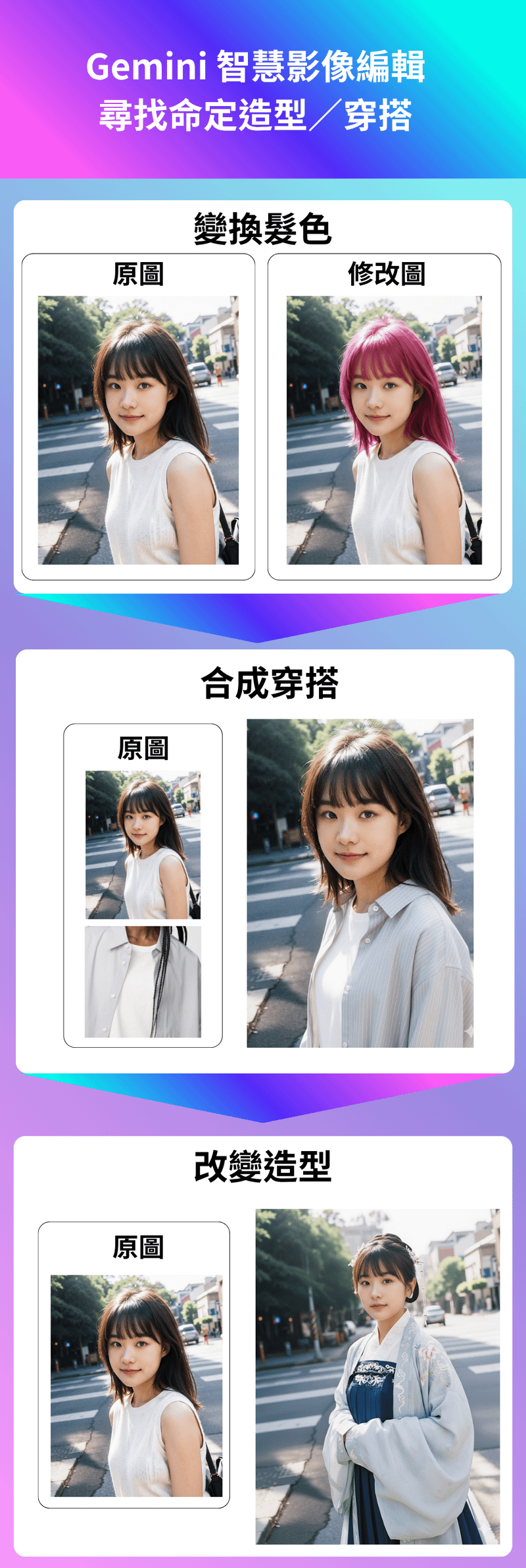 - AI 造型師:上傳照片,快速測試多種髮型與穿搭組合,找出最佳風格