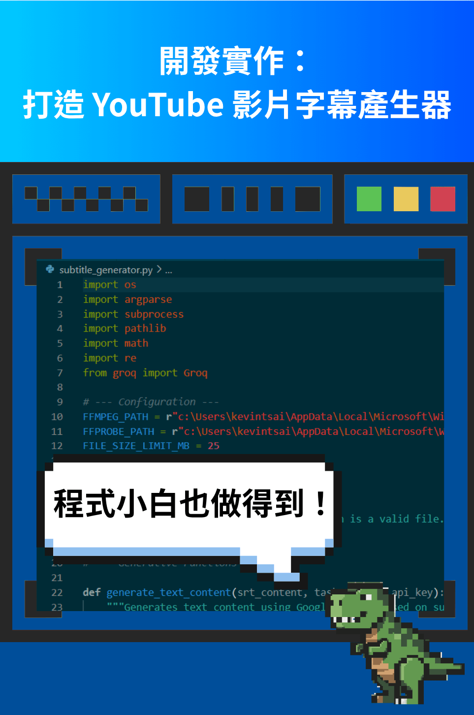 與 AI 協作,體驗 Vibe Coding 的創造樂趣。我們將從零開始,開發一個 YouTube 影片字幕產生器,從提取音訊、語音轉文字,到最後將逐字稿交給 Gemini 生成摘要或社群貼文。