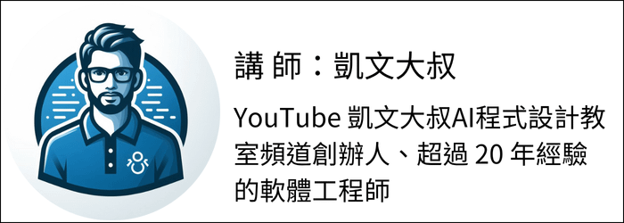 YouTube 頻道「凱文大叔 AI 程式設計教室」創辦人,專注 AI 應用研究相關資訊以及教學。本職為軟體工程師,擁有超過 20 年的 Java 開發經驗,同時在 Amazing Talker 擔任程式語言講師,透過深入淺出的教學方式,幫助學員快速掌握技術。