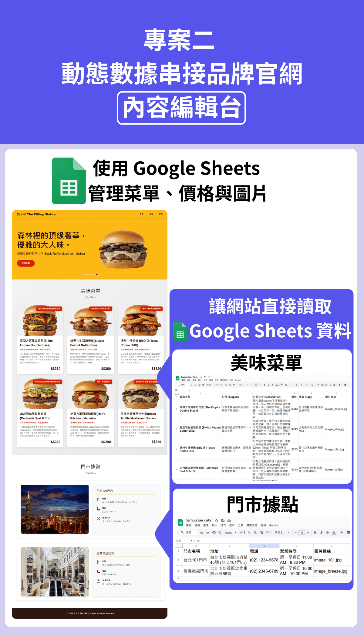 告別「為了改一個價格,搞壞整個網頁」的惡夢。我們將網站連動到你的 Google Sheets。 - 實戰成果: