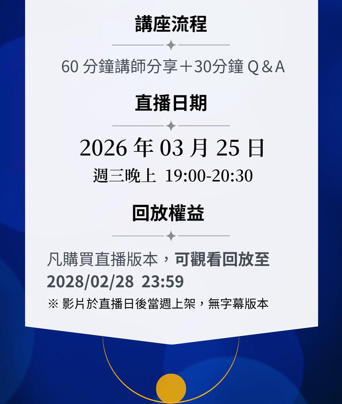 - ZOOM線上直播,2026/03/25(三)晚上19:00 - 20:30(前10分鐘開放入場)