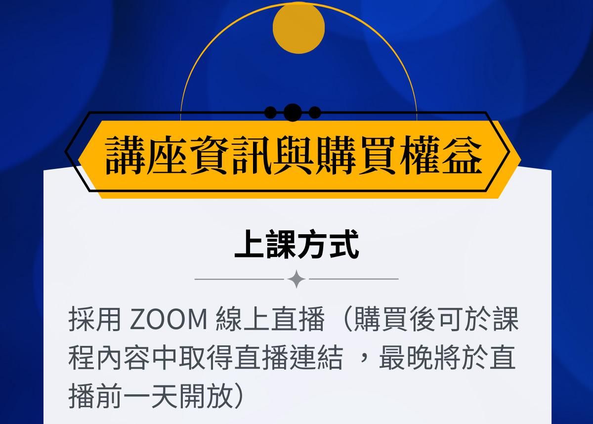 - 購買後可於課程內容中取得直播連結 (最晚將於直播前一天開放)