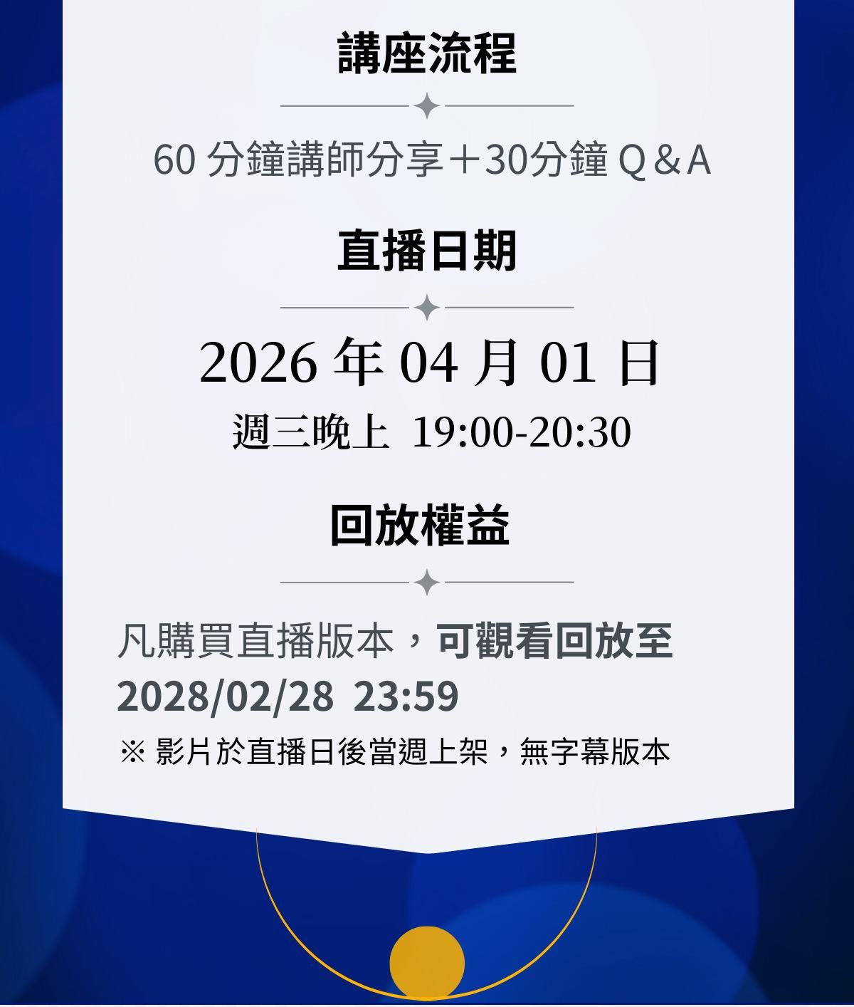 - 回放影片將於直播日當週上架至報名頁,上架時將會發信通知學員