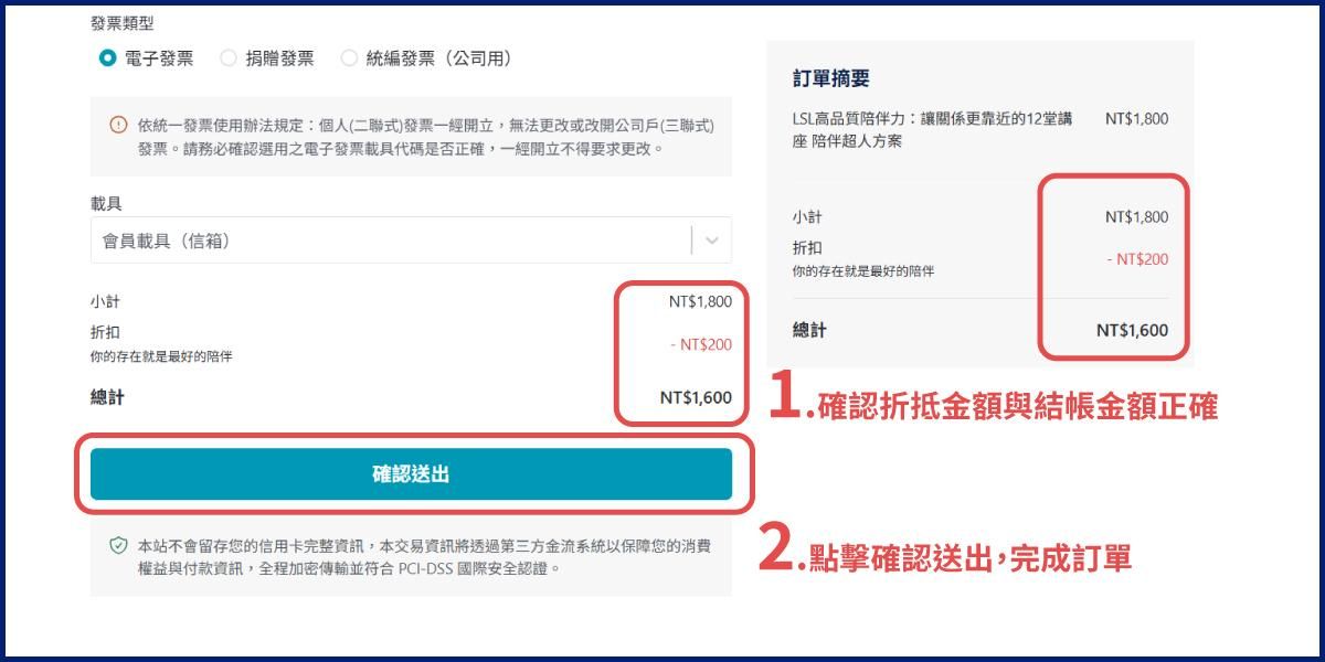 Step 3. 在結帳頁上「訂單摘要」確認課程金額折抵後,請點選「確認送出」即可送出訂單。