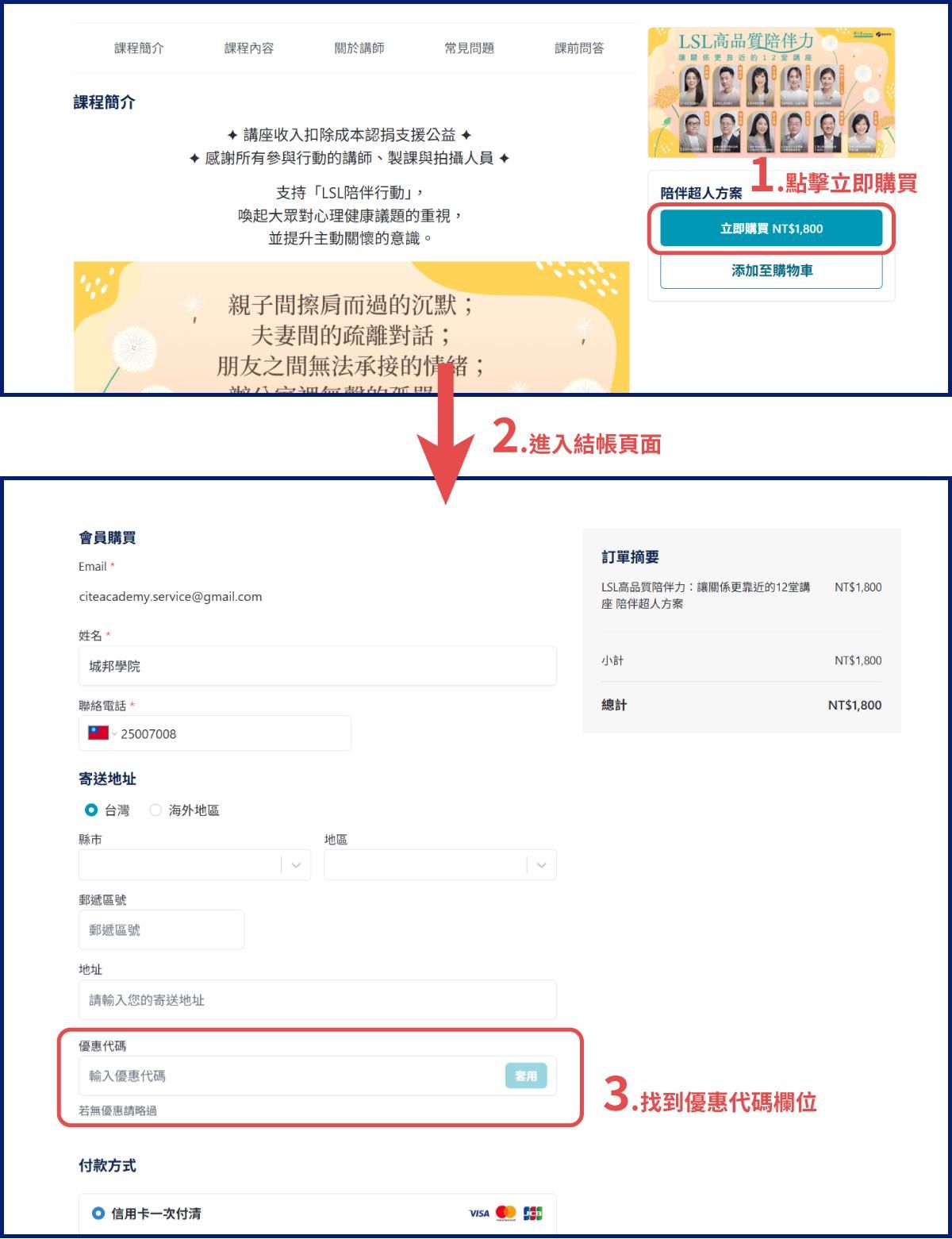 Step 1. 登入後,請點選課程頁中的「立即購買」按鈕,進到結帳頁面後,會看到「優惠代碼」這個欄位。