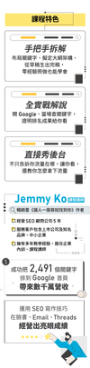 - 「SEO 從零到精」:定價 $12,500 元。目標是讓你從零變成專精,只教實戰、不教系統性理論。(上架於 Jemmy 的平台)