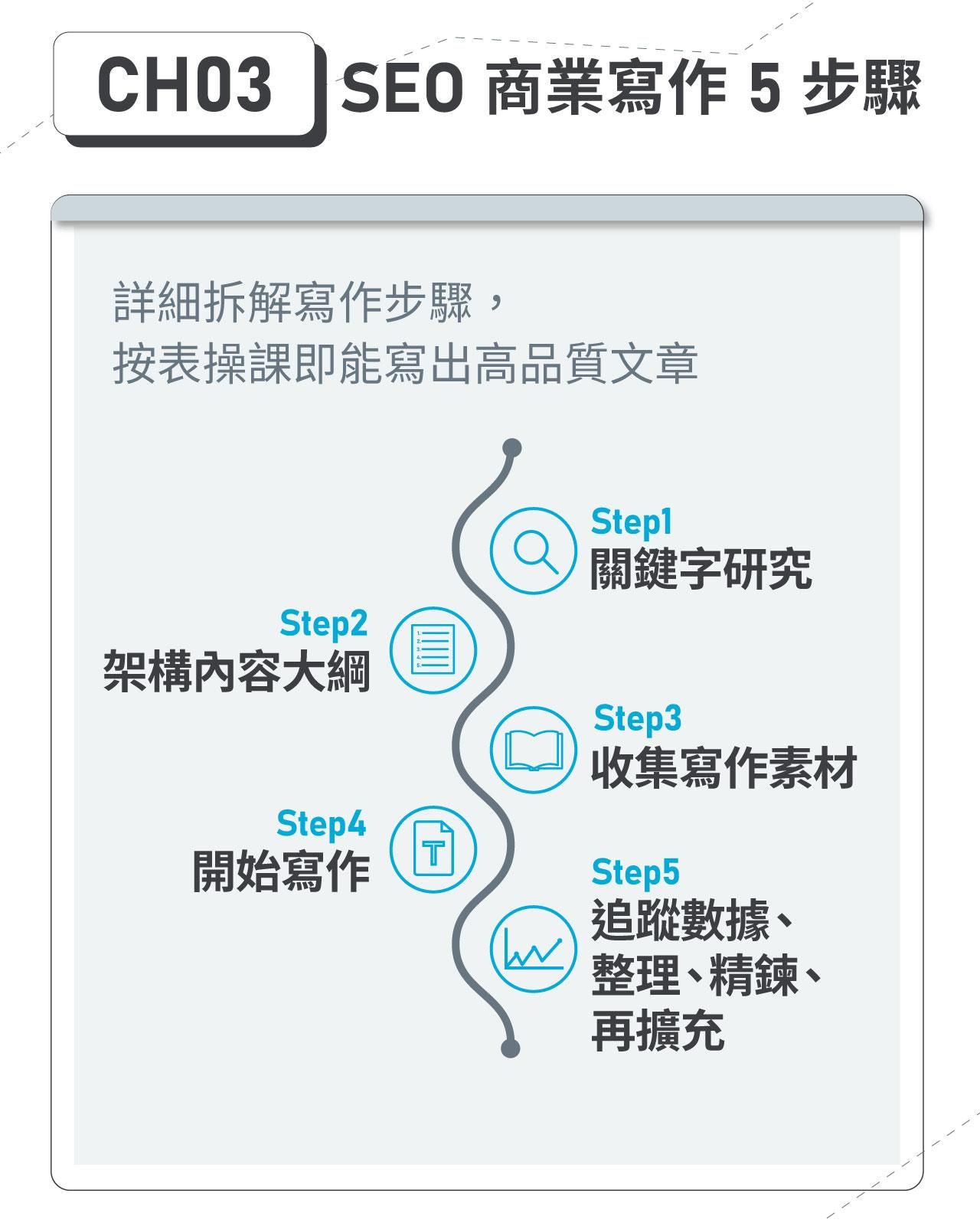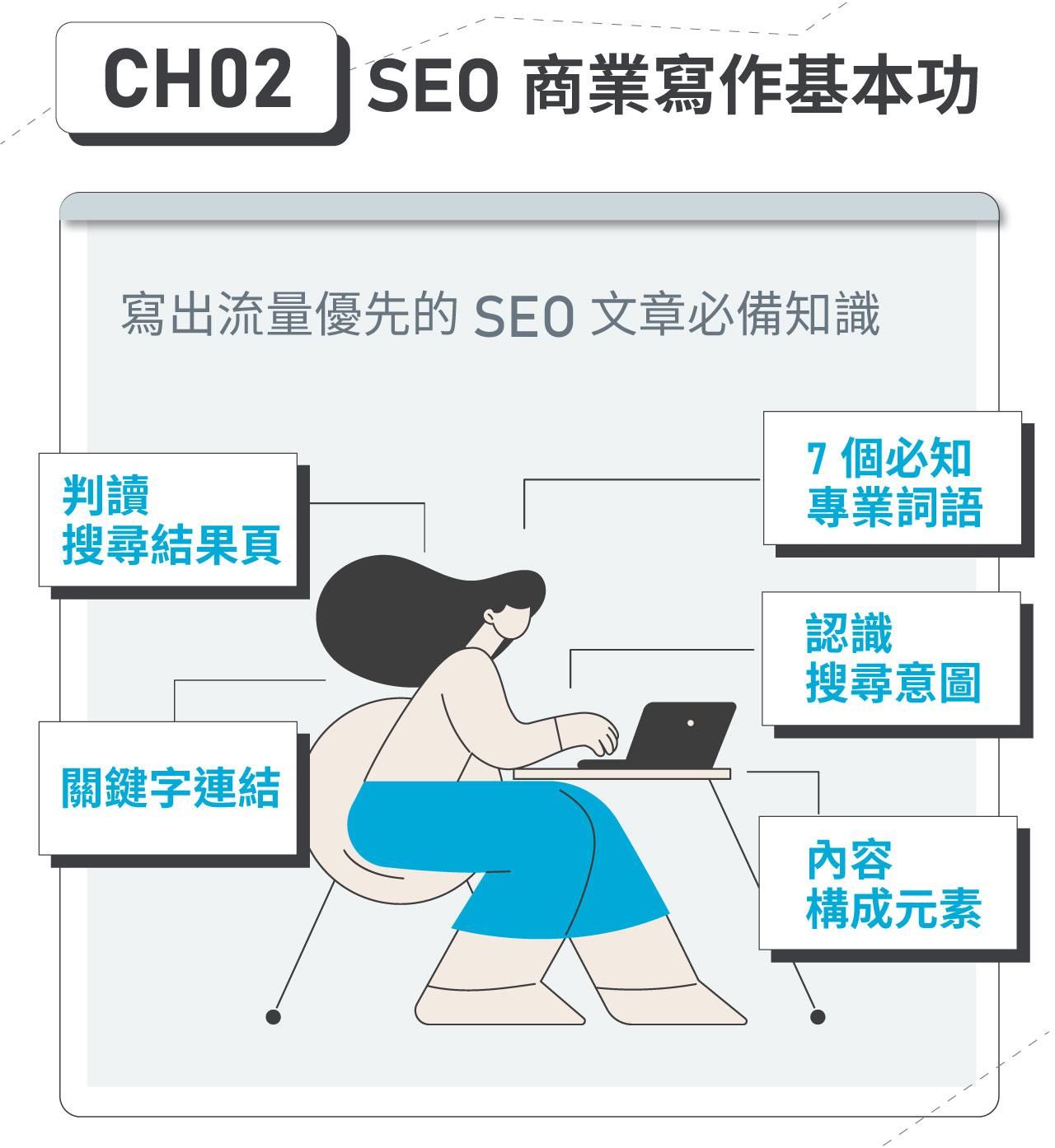 - 「SEO 寫作課 」:步驟化拆解 SEO 文章寫作技巧,以「小白也能學會 SEO 寫作」為主要課程目標,輕鬆好上手。