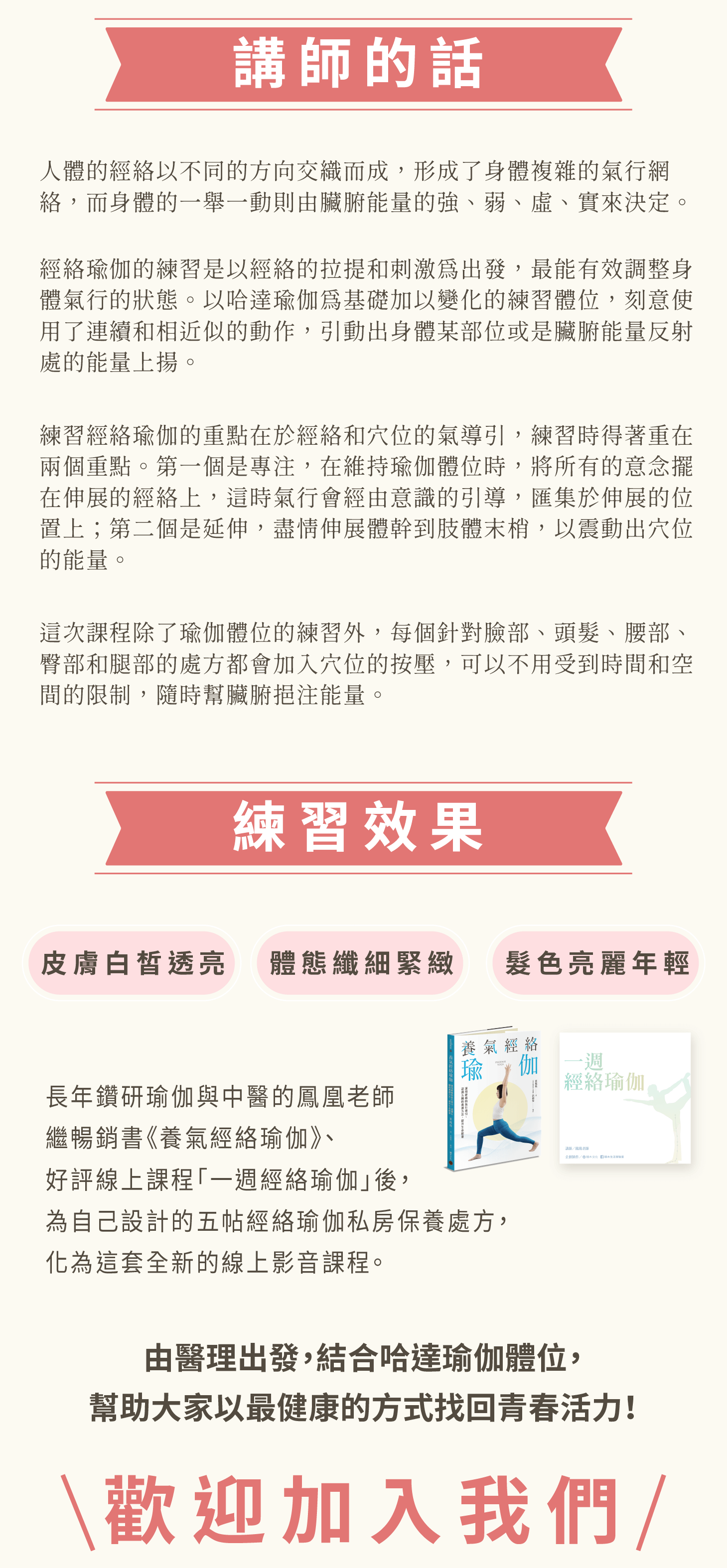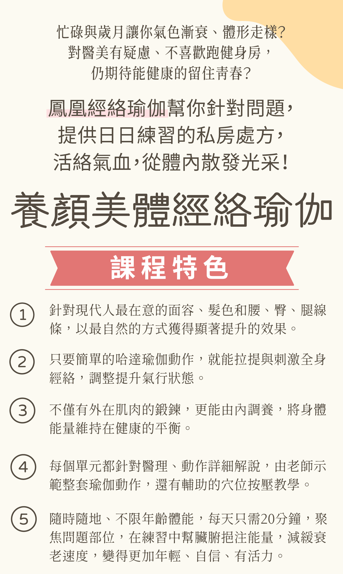 - Ing***:鳳凰老師的口條清晰、動作示範明確清楚。上完課身體都暖了起來,而且是從內至外的溫暖,很舒服。還可學習到經絡的相關知識,真的很棒!