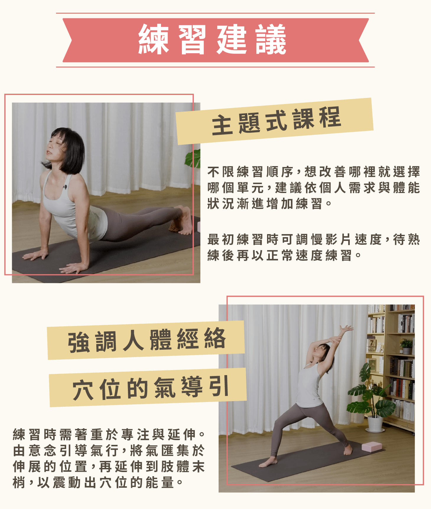 - 每天20分鐘,聚焦問題部位,在每天的練習中,替臟腑挹注能量,由內調養,將身體能量維持在健康的平衡。