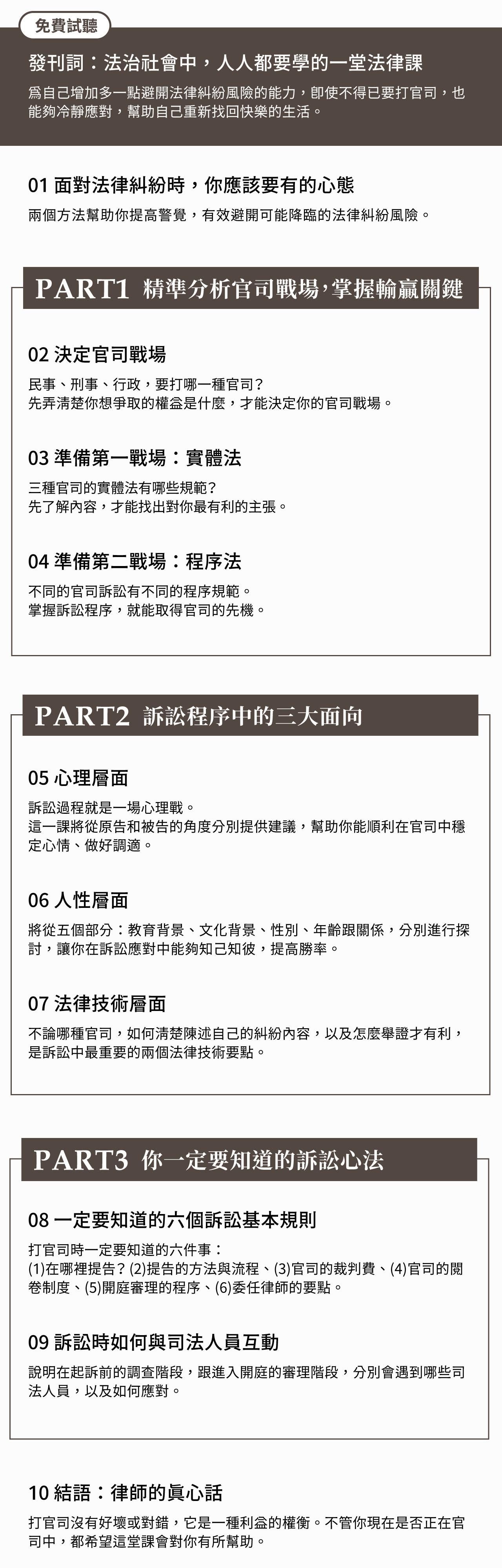 從如何在日常生活中降低法律風險開始,如果發現無可避免需要進到官司,課程將分為三個部分:分析官司戰場、訴訟程序的三大面向,以及訴訟時的心法,幫你快速建立訴訟的基本觀念。