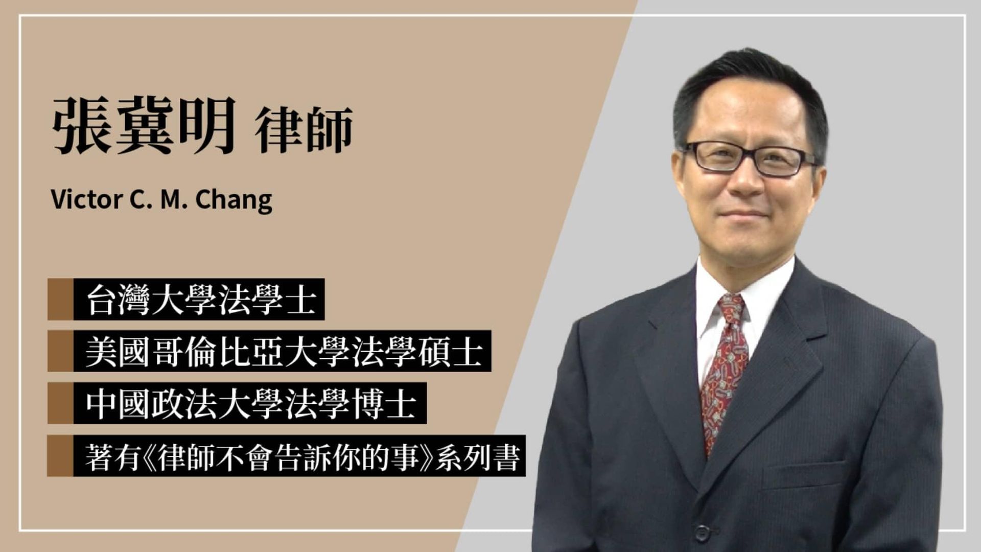 從事法律實務工作近四十年,在台、美、中三地分別取得法律學士、碩士及博士學位,出版《律師不會告訴你的事》系列書,時常勸人盡可能別打官司,如果不得已仍須打官司,就要做好準備,謹慎面對及處理。