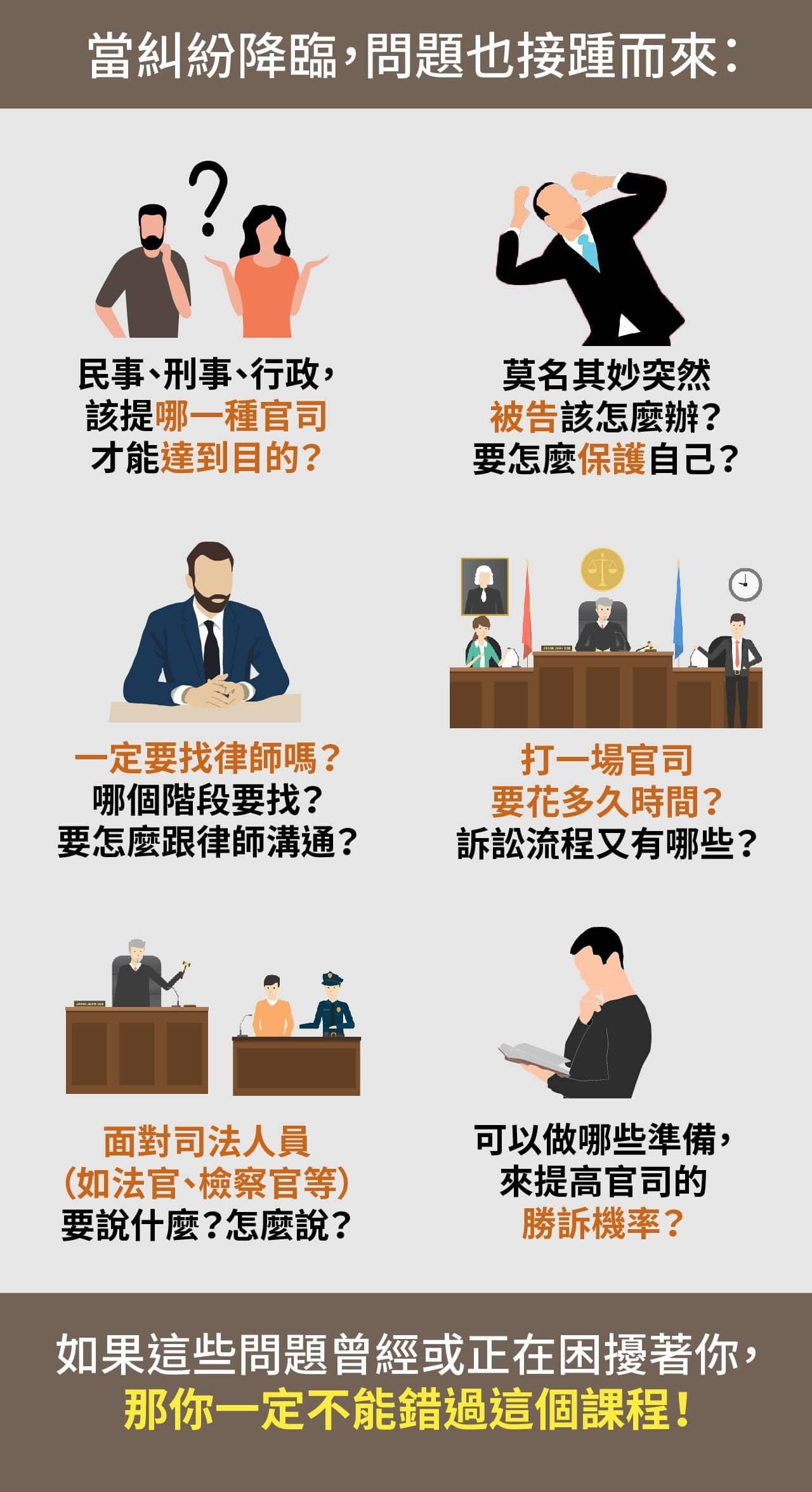 包括面對法律糾紛應該有的心態、如何精準分析案情並選對戰場、訴訟程序的三大面向,以及一定要知道的訴訟心法,都會在這套課程裡完整說明! - 搭配真實案例,情境式說明更好懂