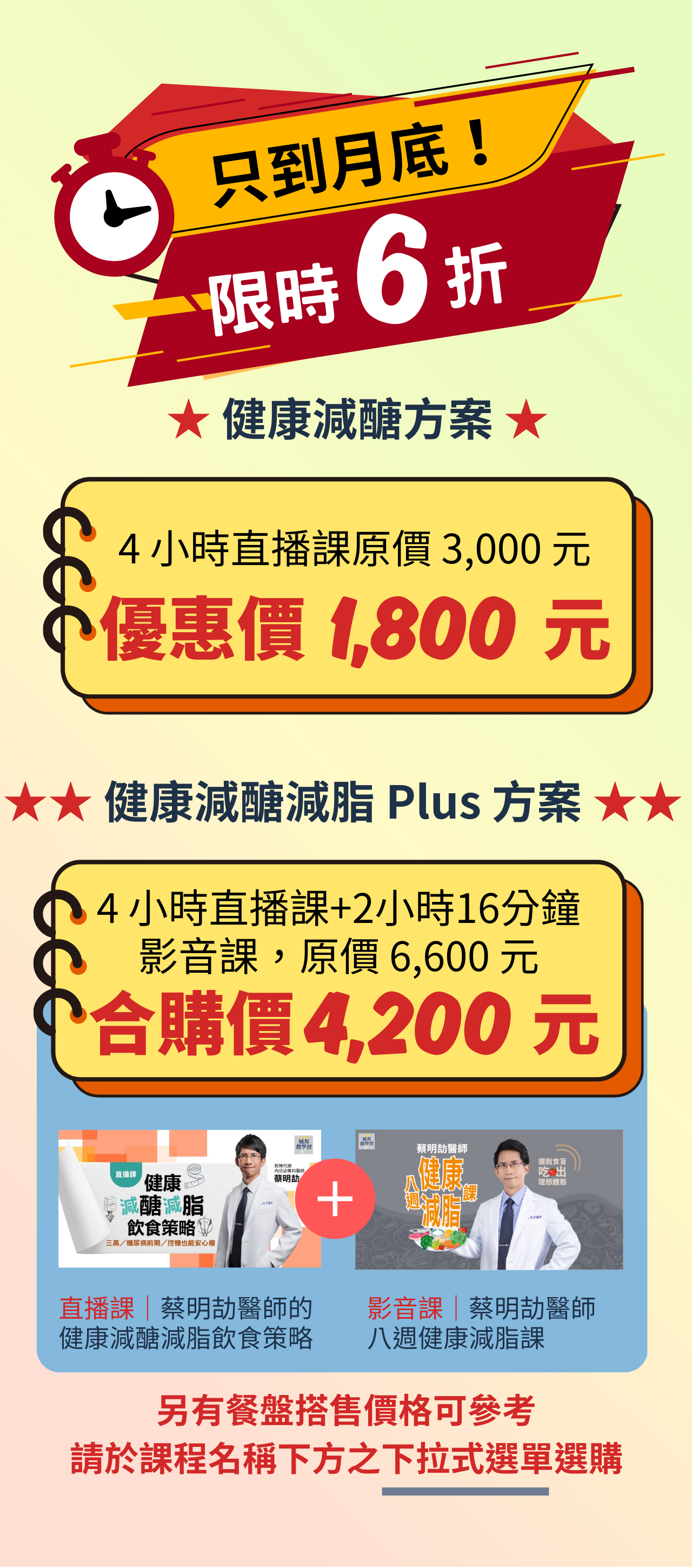 購買「健康減醣減脂 Plus 方案」,包括一堂《蔡明劼醫師八週健康減脂課》線上課程,即可加入八週陪跑社團,一起做減脂喔!
