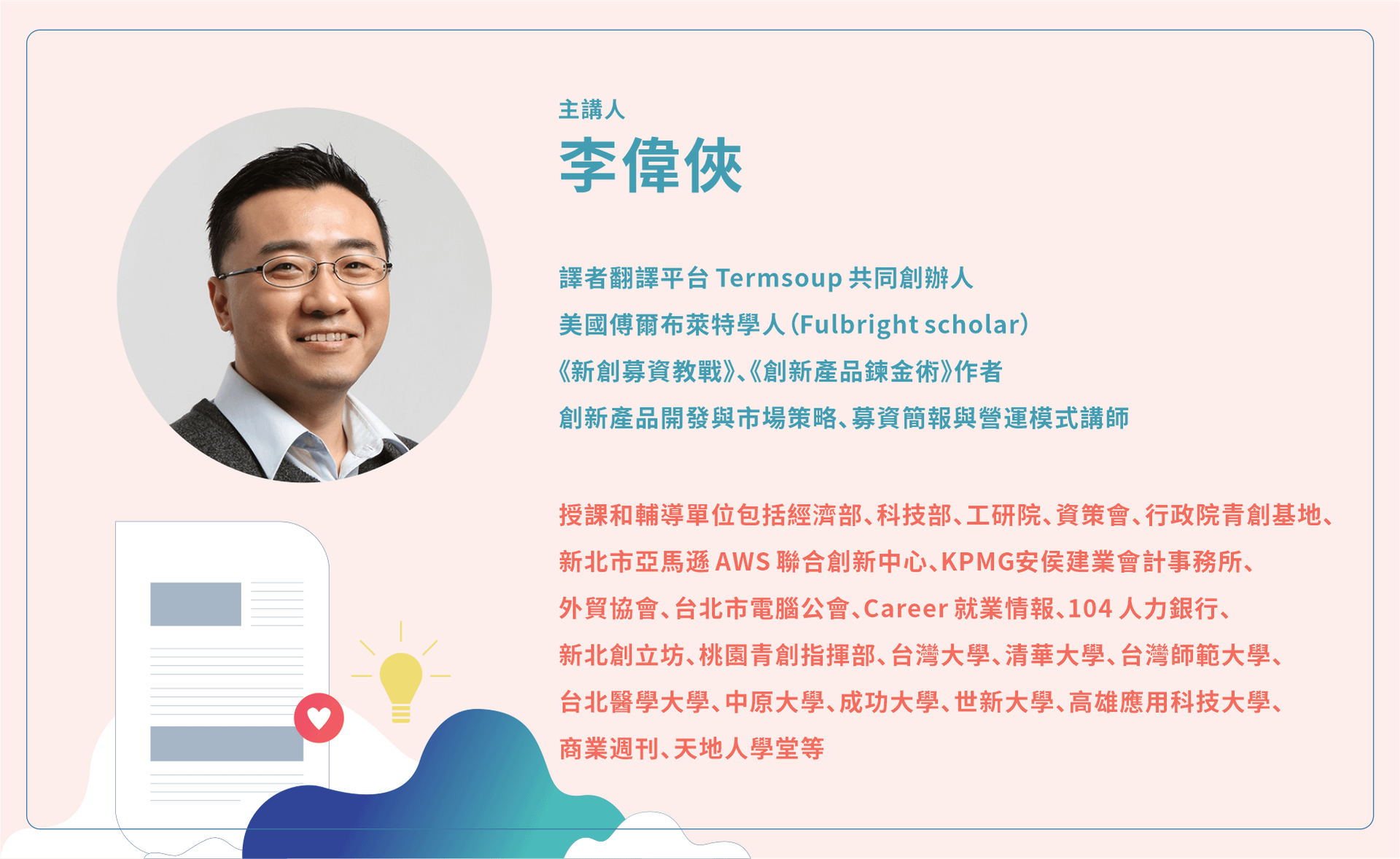 深厚的實戰經驗,精準的方法論分析,幫你把模糊不確定的點子,重新規劃成精準有客戶的產品。
