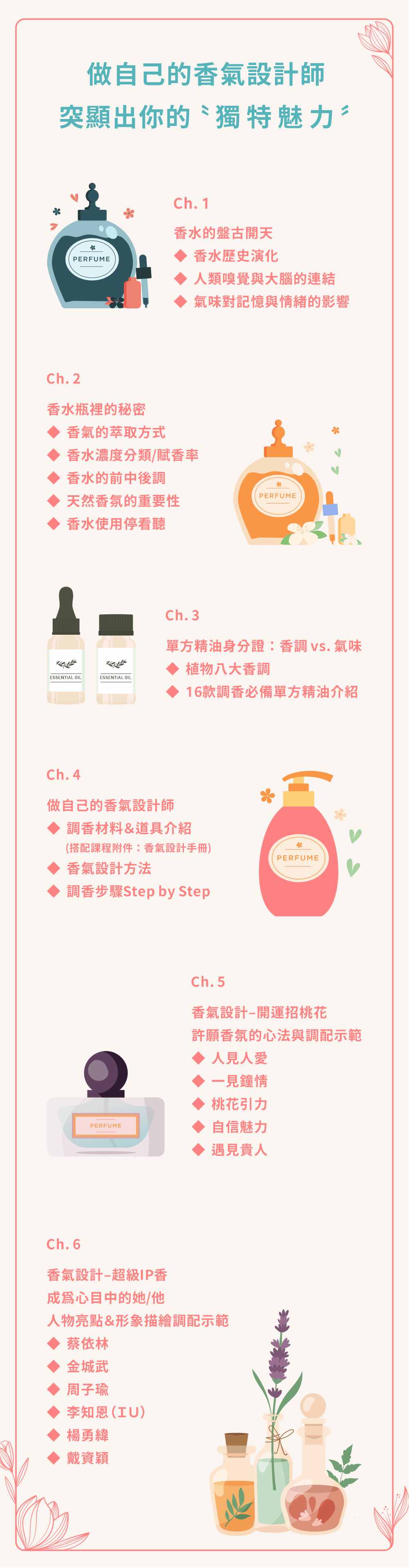 毛毛老師手把手帶領你從設計主題到調配示範,只要跟著做就能完成個人專屬香水,輕鬆學習收穫滿滿!