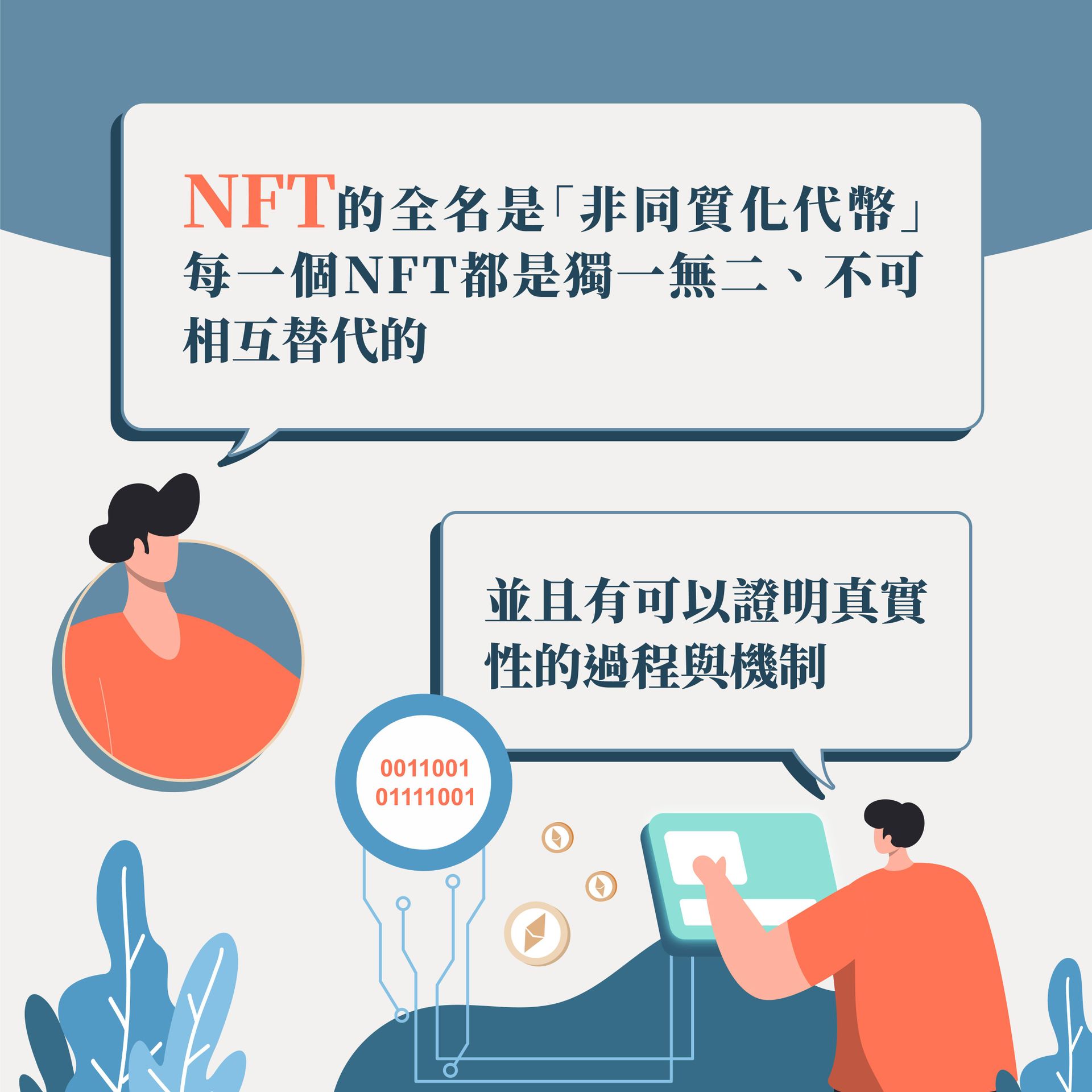 NFT的全名是「非同質化代幣」(Non-Fungible Token),簡單來說,NFT不同於比特幣,全都是一模一樣、價值相同;NFT則相反,每一個NFT都是獨一無二、不可相互替代的。