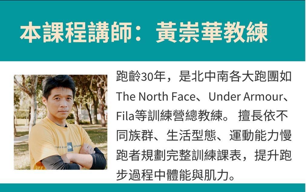 跑齡有30年的黃崇華教練是北中南各大跑團如The North Face、Under Armour、Fila等訓練營總教練, 擅長依不同族群、生活型態、運動能力慢跑者規劃完整訓練課表,提升跑步過程中體能與肌力。